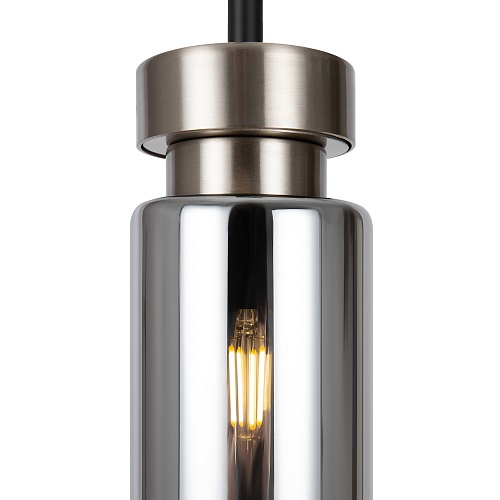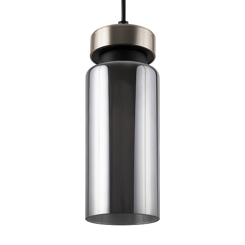 Металлическая арматура в двух оттенках: никель и черный с золотом. Плафон – глянцевое стекло. Цвет – серый. Оригинальная вытянутая цилиндрическая форма для акцентной подсветки. Источник света – лампа с цоколем E14.