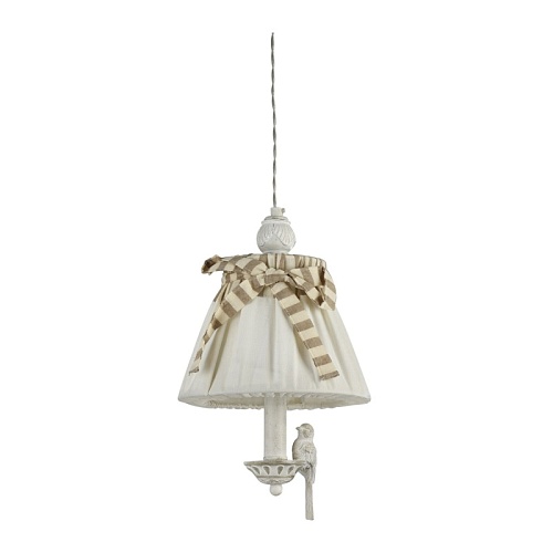 Материал арматуры – металл, цвет – белый антик. Льняные абажуры дополнены лентами. Резные элементы. Символичный декор - фигурки птиц на розетках. Высота люстр регулируется.