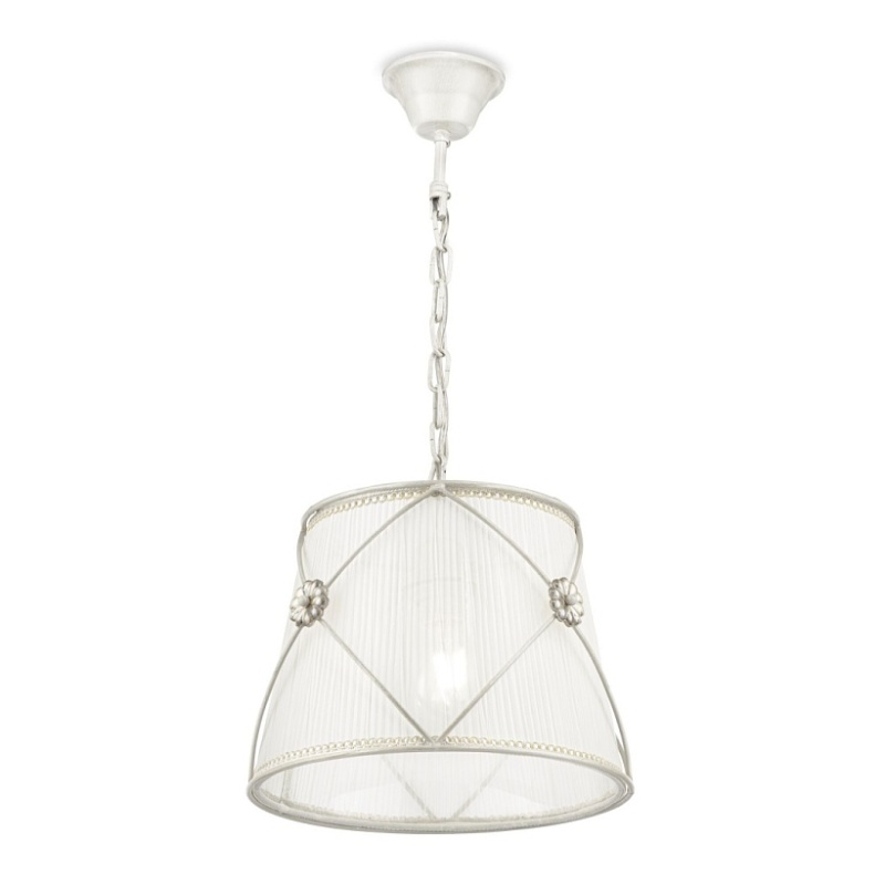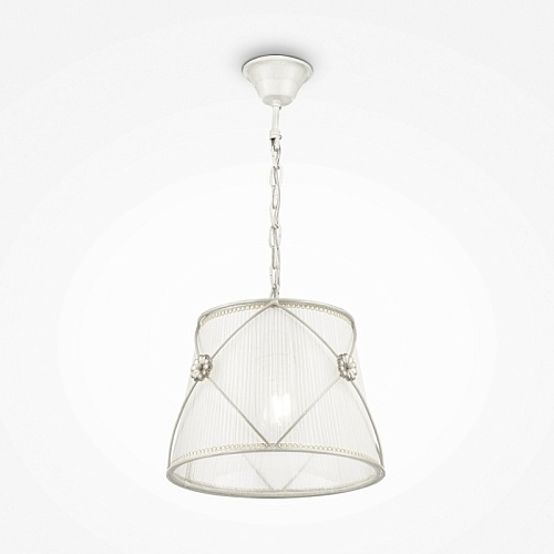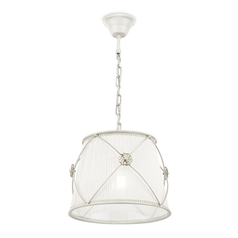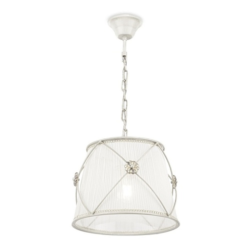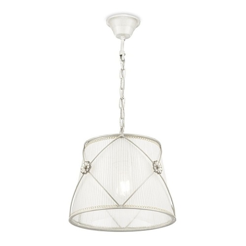 Арматура из металла в жемчужно-белом цвете. Кремовый абажур из плиссиро ванной органзы, окантовка золотистой тесьмой. Абажур заключен в металличе ский каркас. Флористический декор.