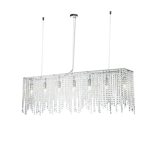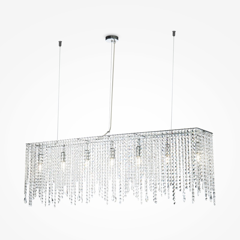 Арматура из металла в цвете хром. Декор – подвески из прозрачного хрусталя. Оригинальная прямоугольная форма. Высота светильников регулируется тросом.