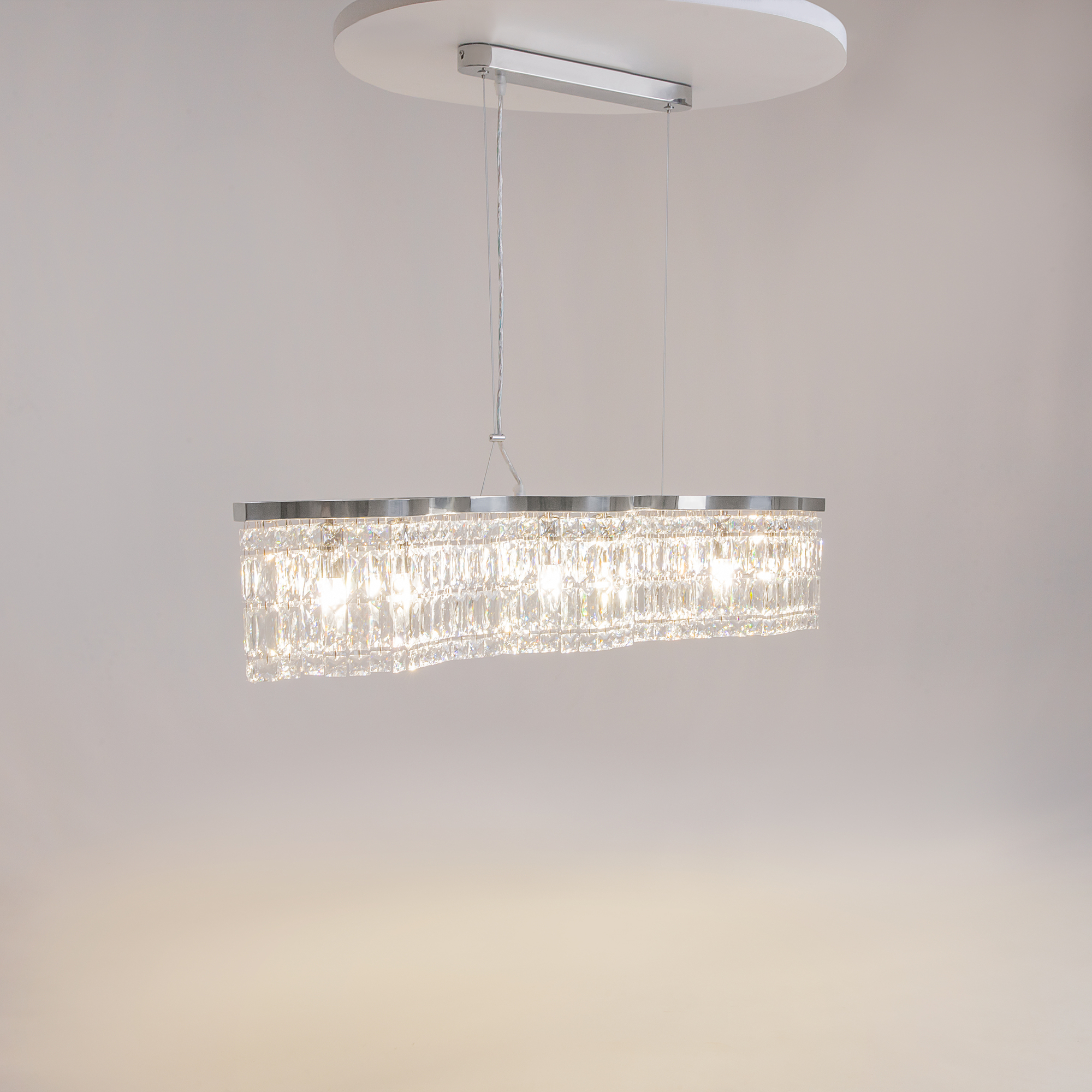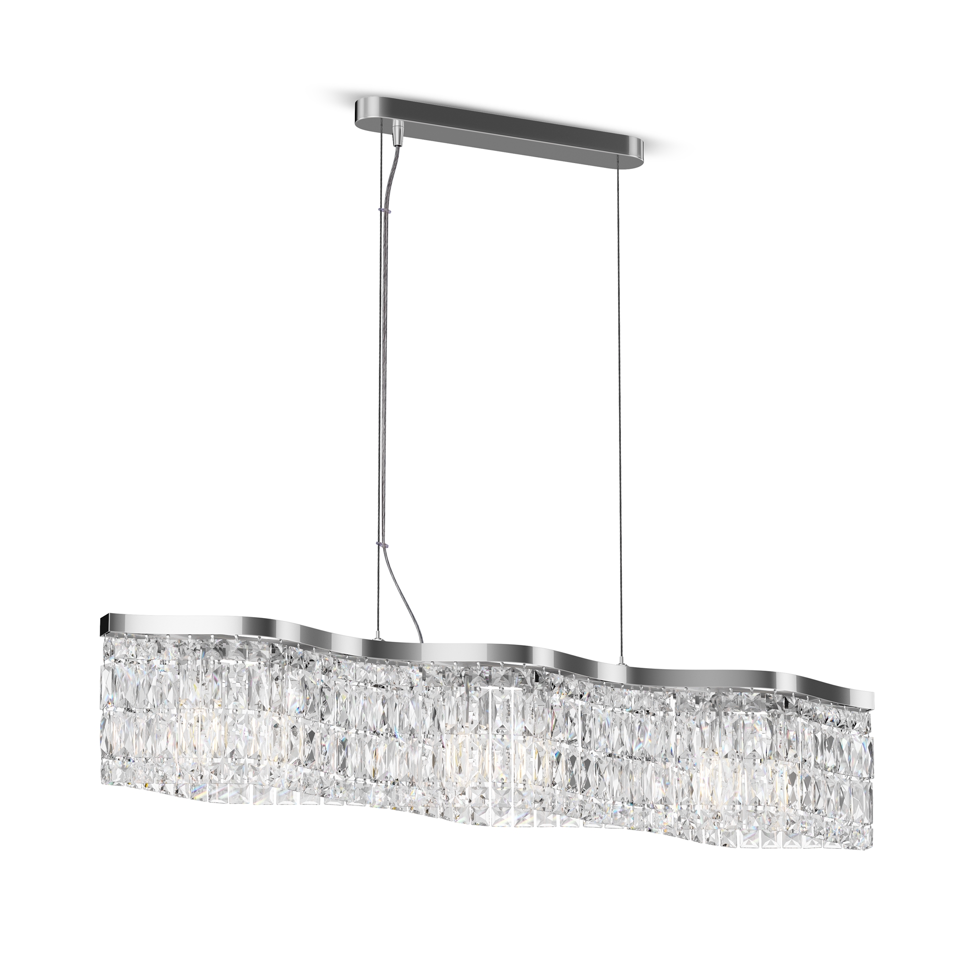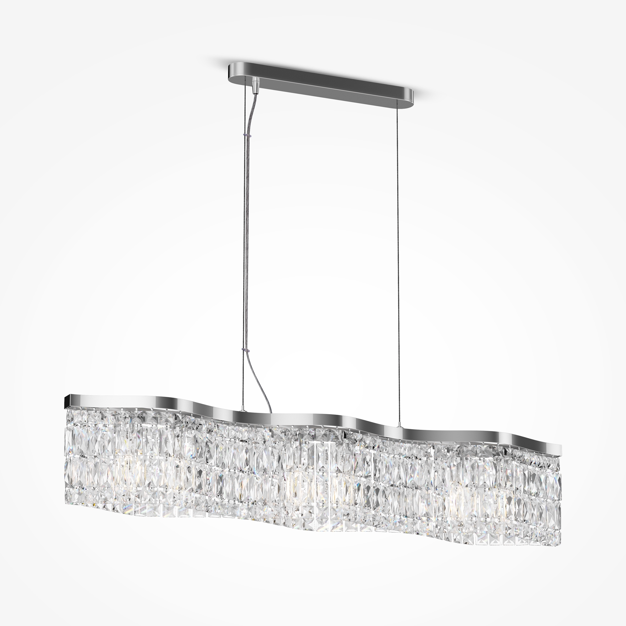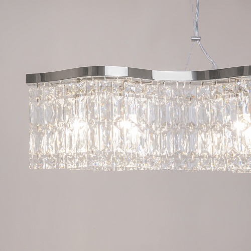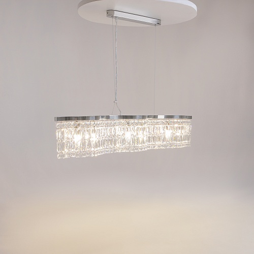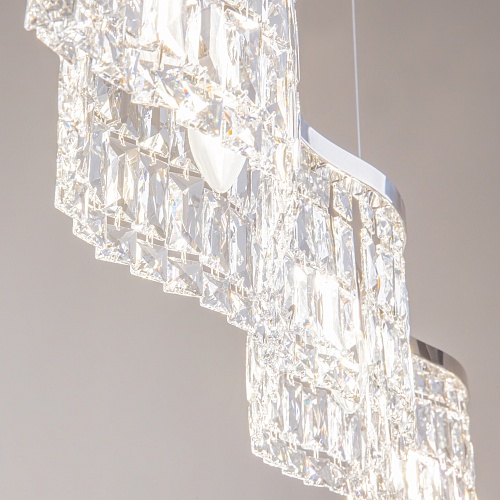 Металлическая арматура в двух оттенках: хром, золото. Декор – прозрачные кристаллы. Потолочные модели имеют два яруса подвесок. Высота подвесной люстры регулируется тросом.