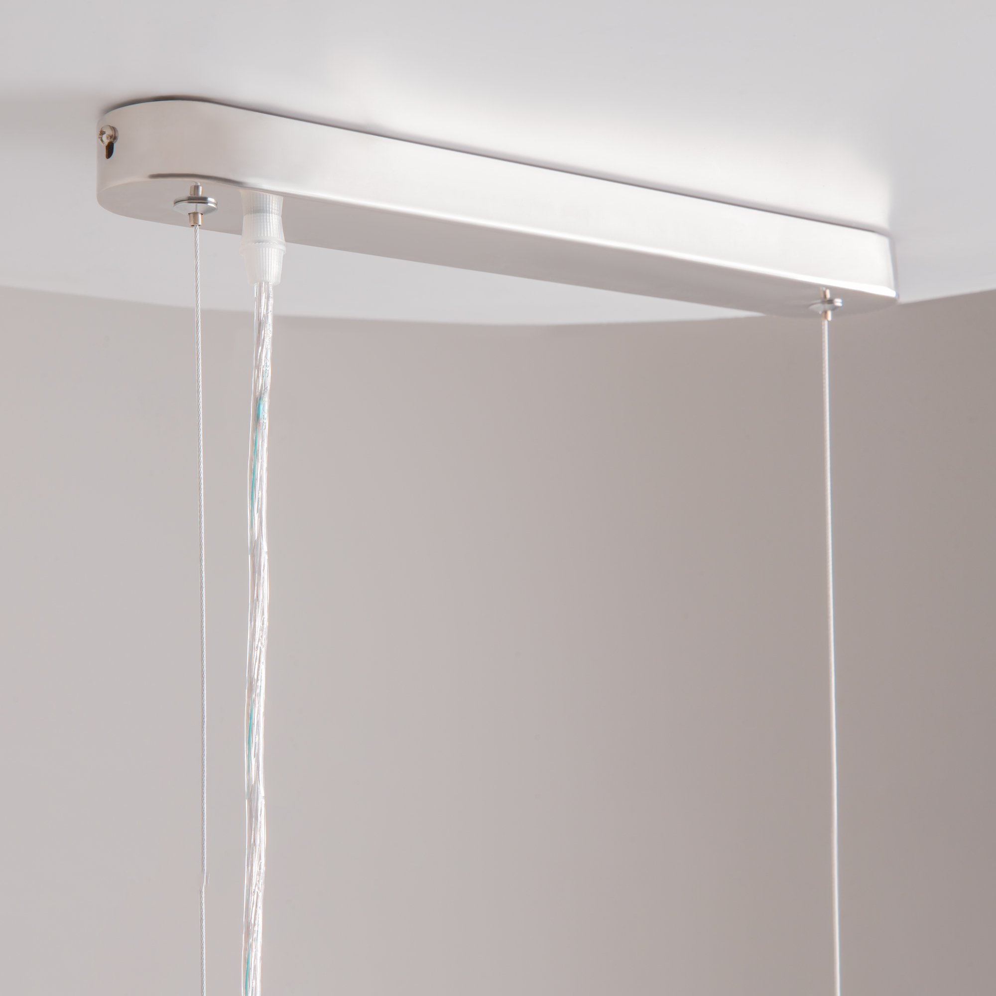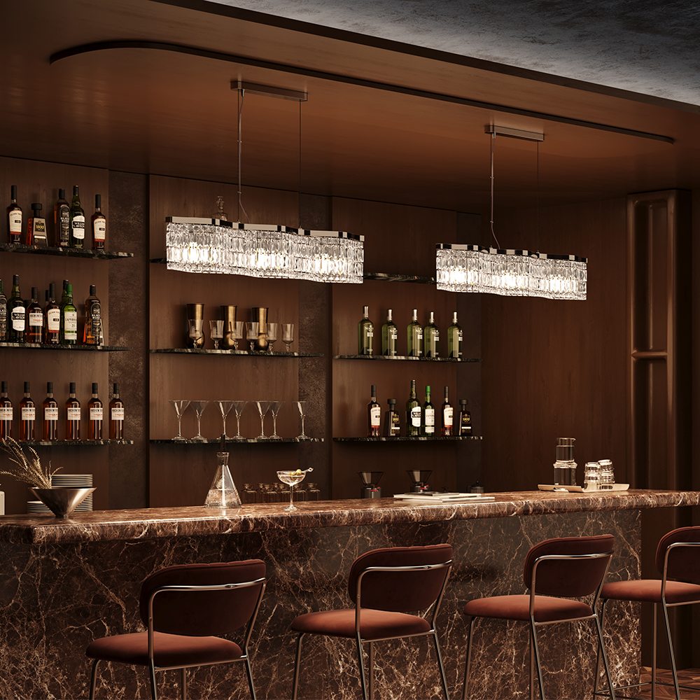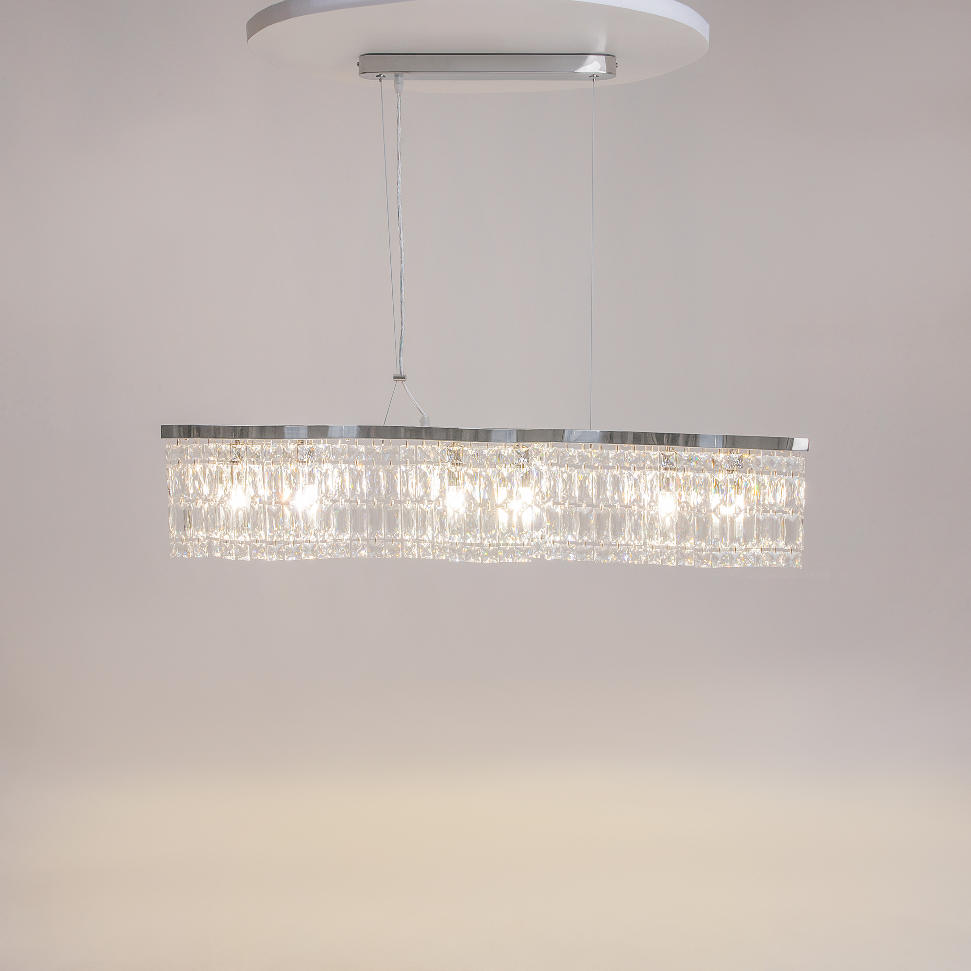 Металлическая арматура в двух оттенках: хром, золото. Декор – прозрачные кристаллы. Потолочные модели имеют два яруса подвесок. Высота подвесной люстры регулируется тросом.