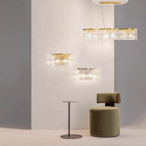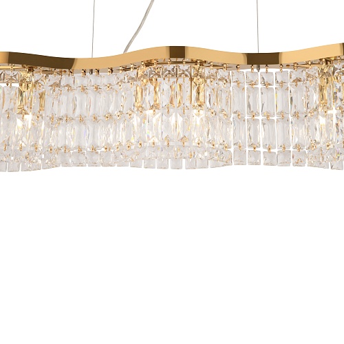 Металлическая арматура в двух оттенках: хром, золото. Декор – прозрачные кристаллы. Потолочные модели имеют два яруса подвесок. Высота подвесной люстры регулируется тросом.