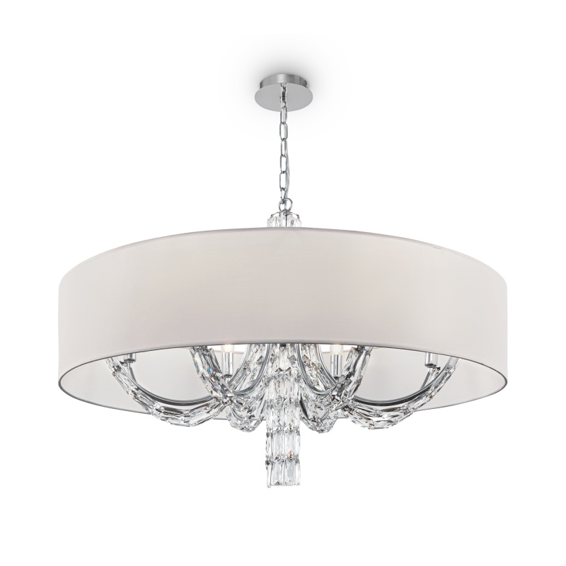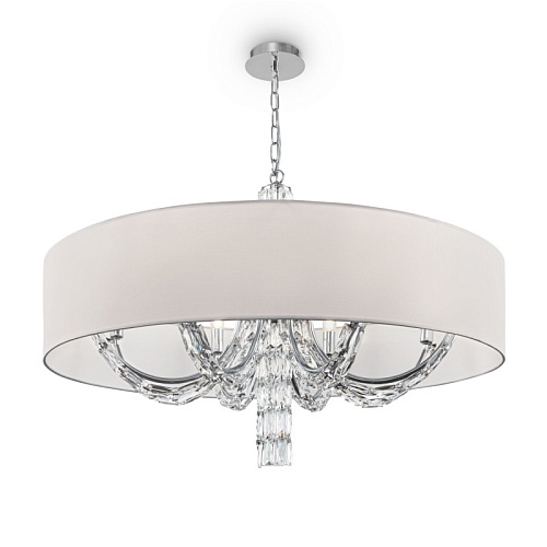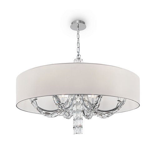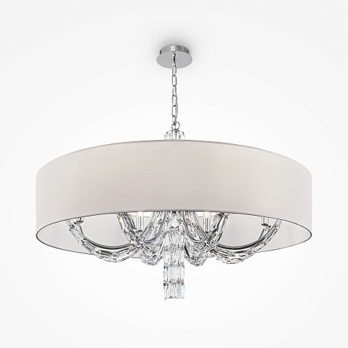 Арматура из металла, цвет – хром. Абажуры из текстиля, нанесенного на ПВХ. Цвет – белый. Декор – массивные кристаллы сложной огранки. Высота подвесных моделей регулируется.