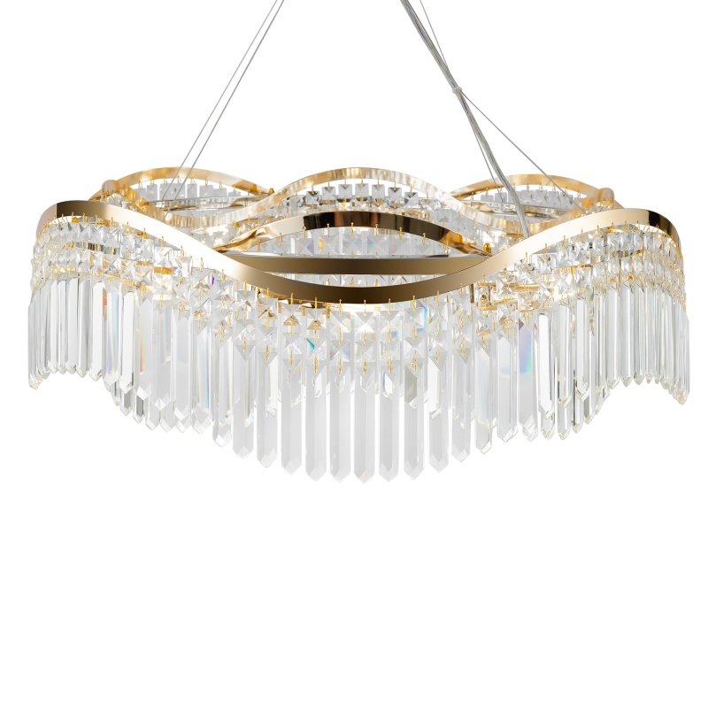 Металлическая арматура в золотом цвете. Декоративные подвески различной формы и огранки. Оригинальные волнообразные очертания светильника. Трендовый эффект парения. Ассортимент для общей и зональной подсветки.