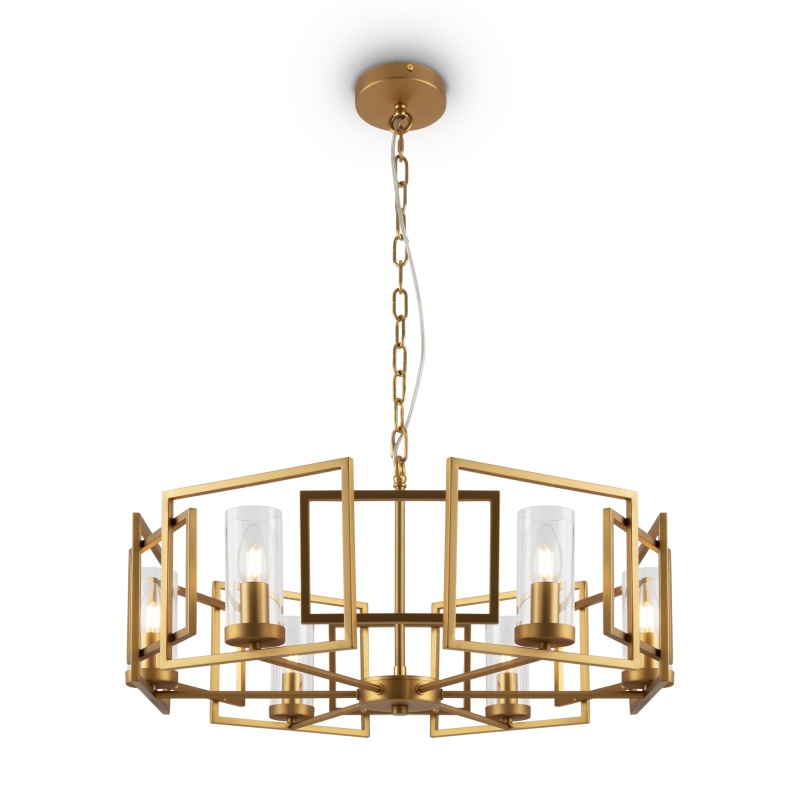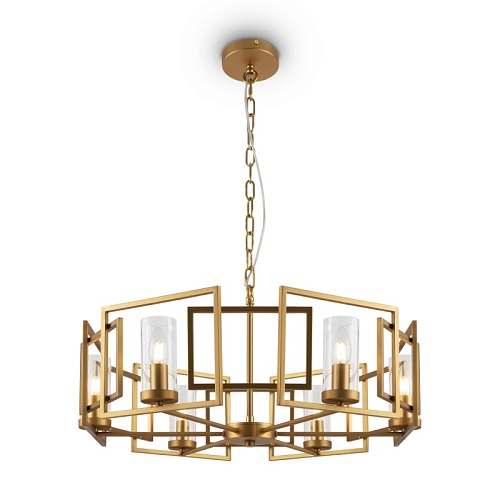 Арматура – металл, цвет – золото. Плафоны из прозрачного стекла. Каркас из наложенных друг на друга металлических рамок. Крепление 2 в 1 – монтаж с цепью и без нее.
