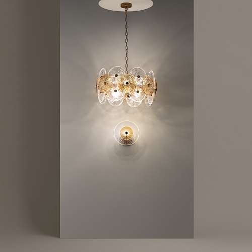 Металлическая арматура в золотом цвете. Сферический декор из штампованного рельефного стекла. Комбинация янтарного и прозрачного оттенка в декоре. Регулируемая высота.