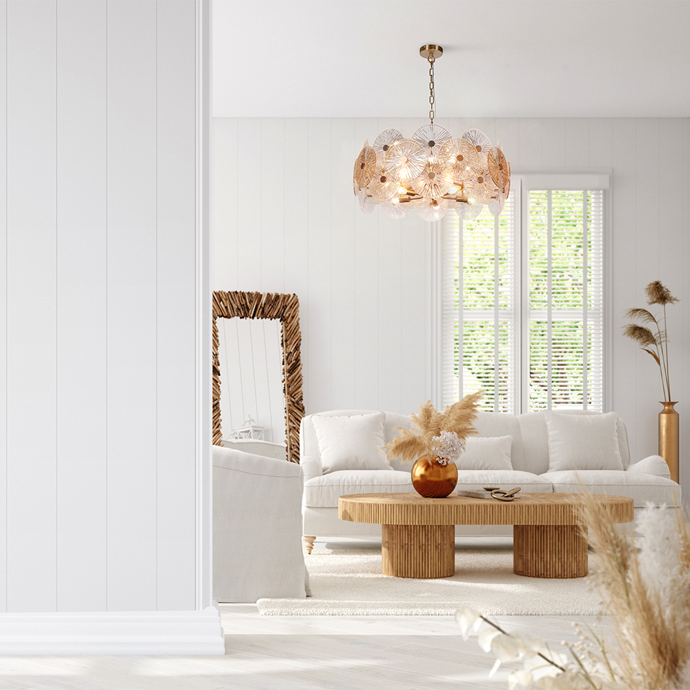 Металлическая арматура в золотом цвете. Сферический декор из штампованного рельефного стекла. Комбинация янтарного и прозрачного оттенка в декоре. Регулируемая высота.