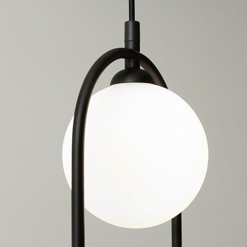 Арматура из металла в трех оттенках: белый, черный, латунь. Плафоны-сферы закреплены на округлом металлическом каркасе. Материал плафонов — выдувное стекло, цвет — белый. Высота подвесных моделей регулируется.