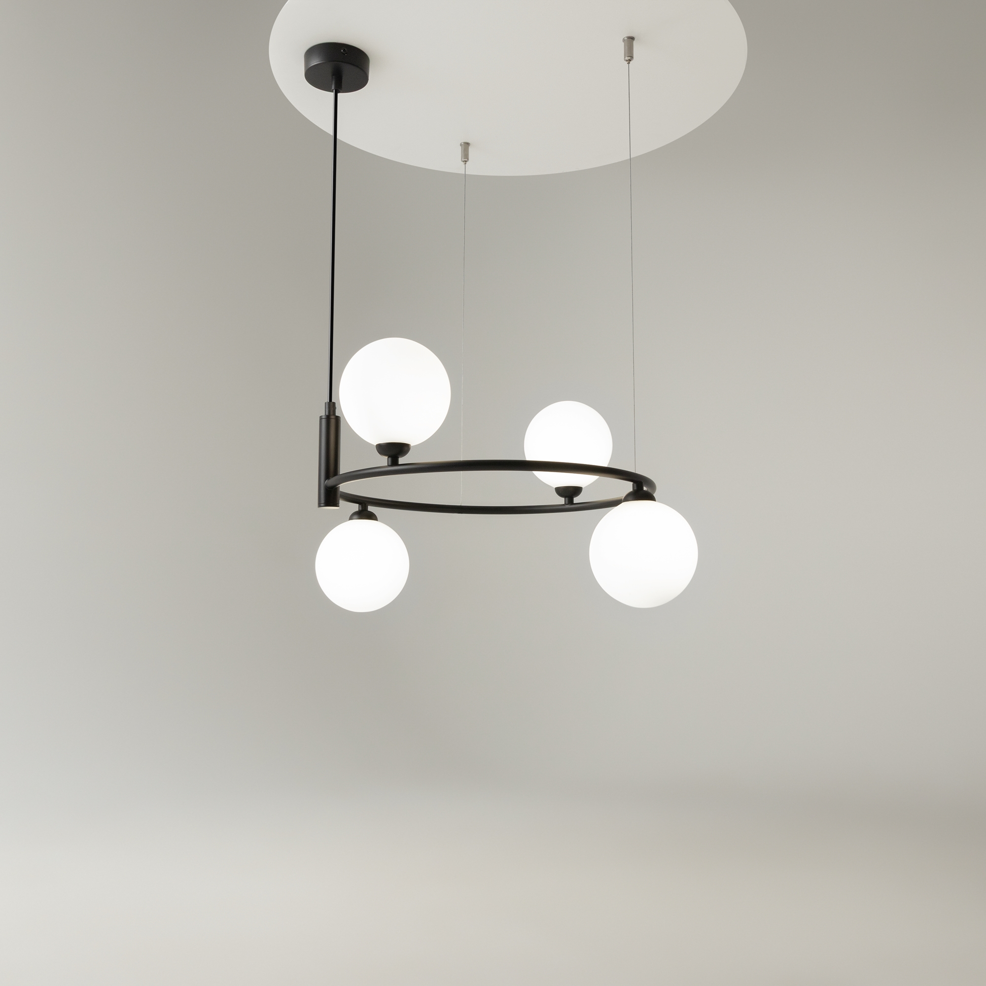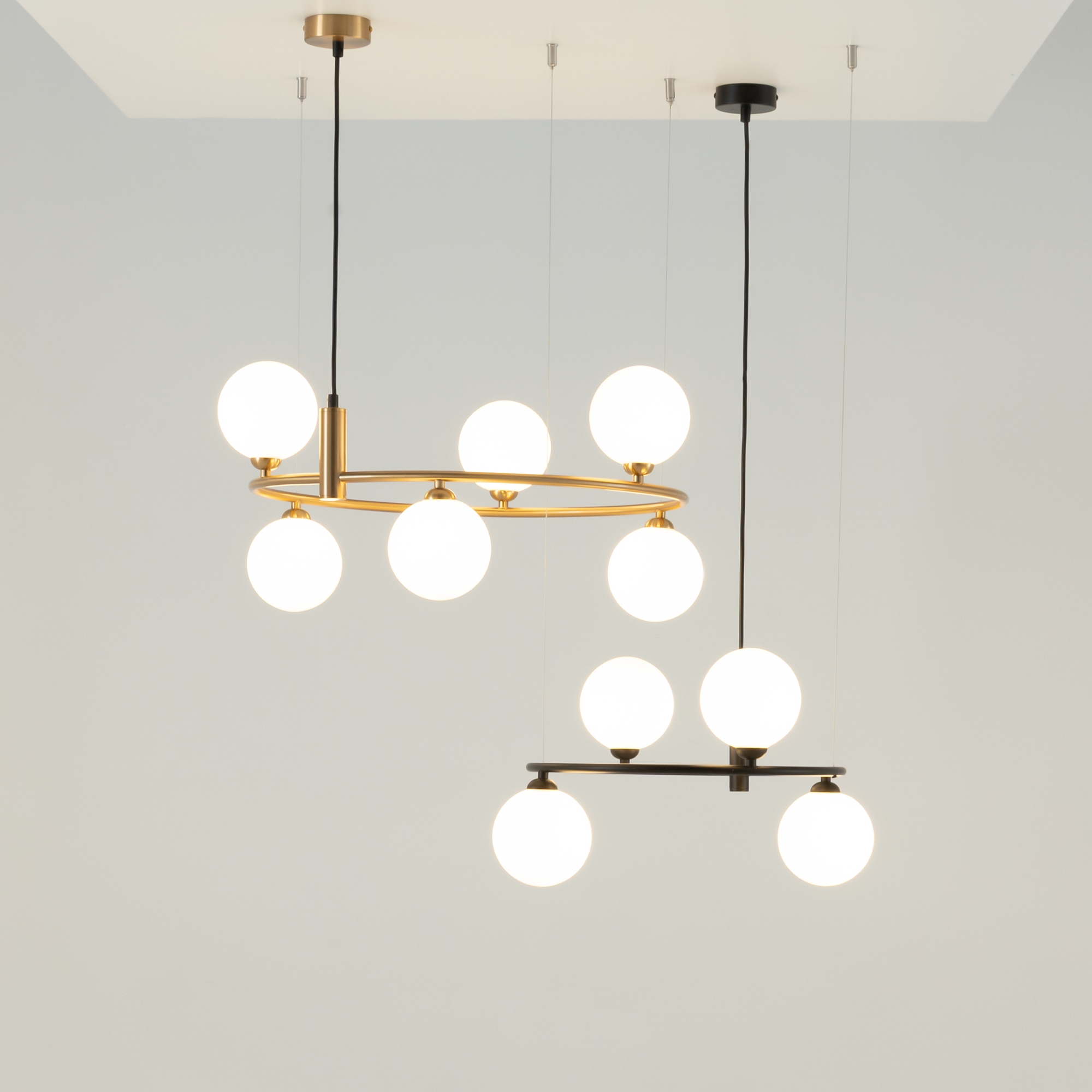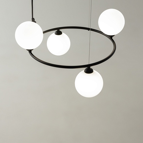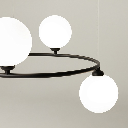 Арматура из металла в трех оттенках: белый, черный, латунь. Плафоны-сферы закреплены на округлом металлическом каркасе. Материал плафонов — выдувное стекло, цвет — белый. Высота подвесных моделей регулируется.