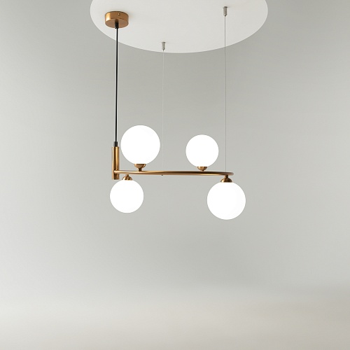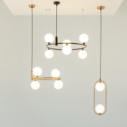 Арматура из металла в трех оттенках: белый, черный, латунь. Плафоны-сферы закреплены на округлом металлическом каркасе. Материал плафонов — выдувное стекло, цвет — белый. Высота подвесных моделей регулируется.