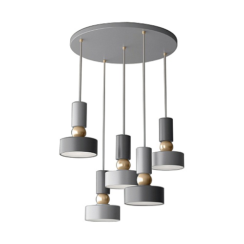 Арматура из металла в сером цвете. Металлические абажуры окрашены в тон арматуре. Источники света – лампы с цоколем Е14 – скрыты под акриловым рассе ивателем.