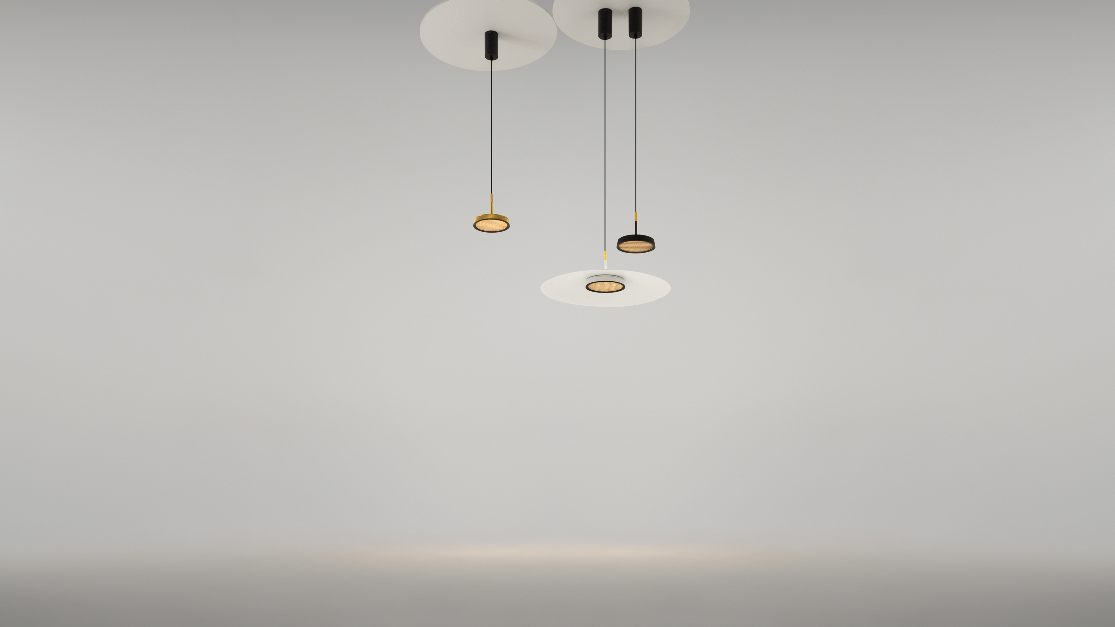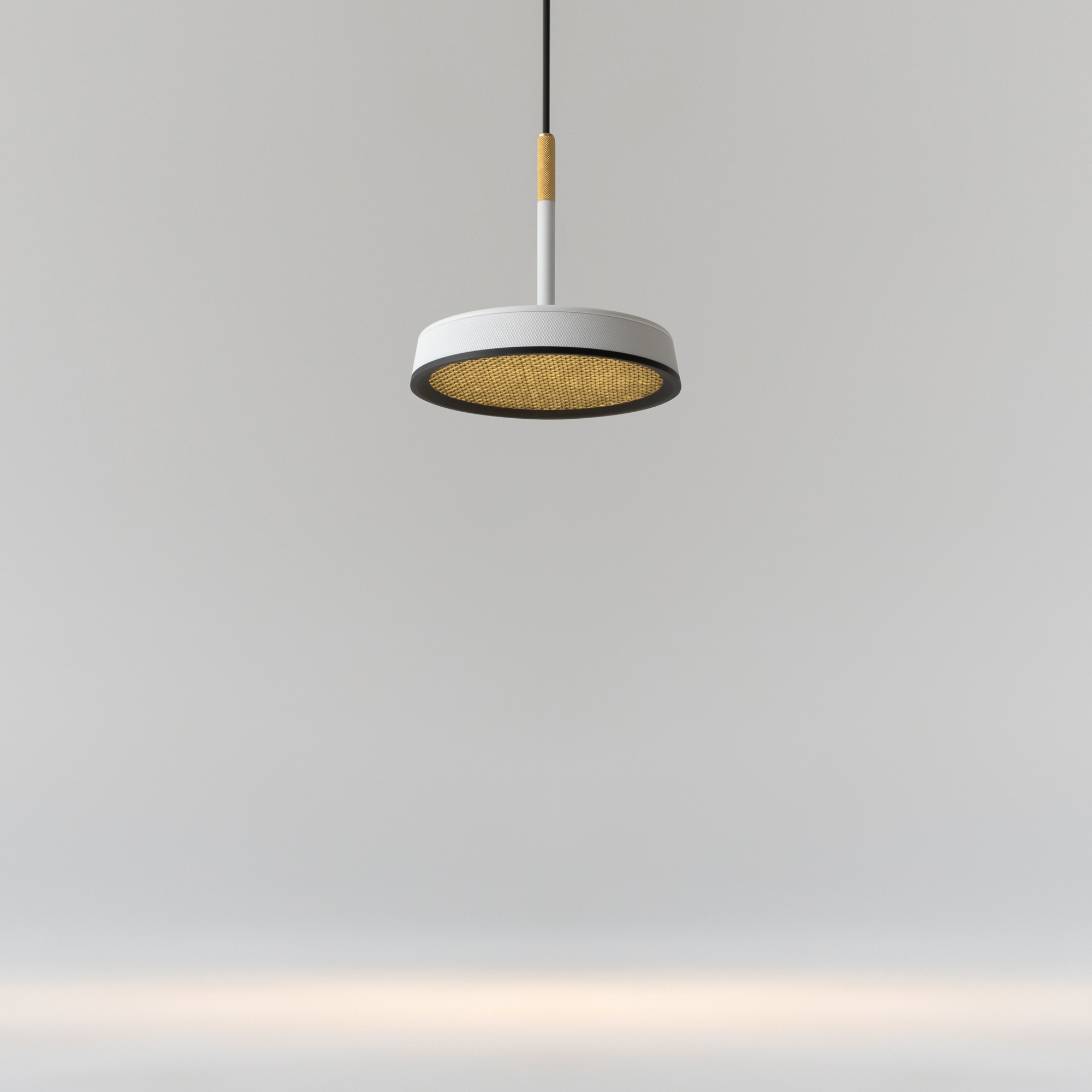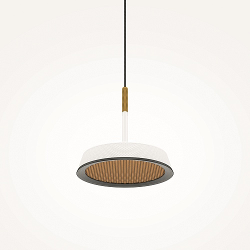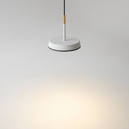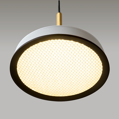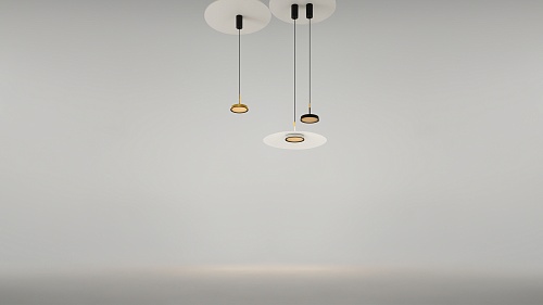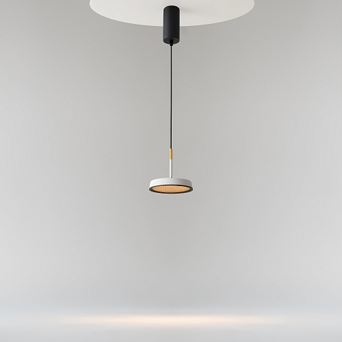 Металлический корпус, цветовая палитра - черный, белый, золото и терракотовый. Два вида плафонов: «таблетка» с графичным рельефом из ассиметричных линий; «таблетка» + идеально-гладкая металлическая «тарелка». Дизайн вдохновлен супрематической эстетикой. LED-источник света, цветовая температура - 3000К. Регулируемый провод - 3 метра.