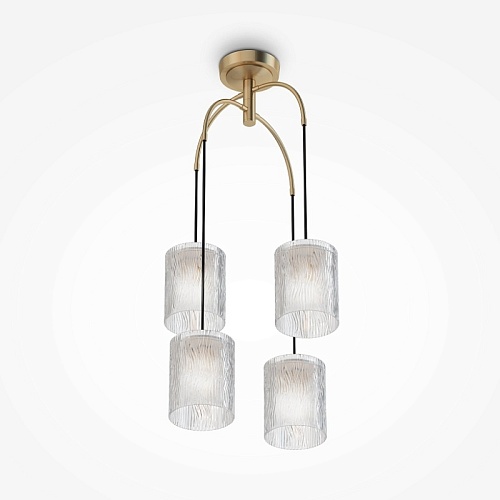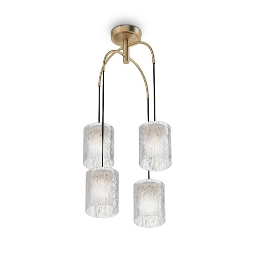 Металлическая арматура, цвет – латунь. Фактурные плафоны из прозрачного стекла. Рельефный узор с эффектом дождевых струй. Ре