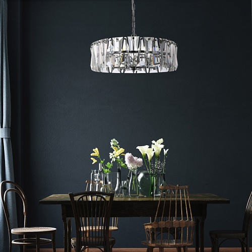 Материал арматуры – металл, оттенки – хром и золото. Декор – массивные крис таллы сложной огранки. Высота подвесных моделей регулируется длиной цепи. Источник света - лампа с цоколем Е14.