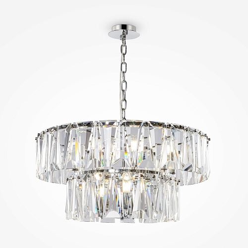 Материал арматуры – металл, оттенки – хром и золото. Декор – массивные крис таллы сложной огранки. Высота подвесных моделей регулируется длиной цепи. Источник света - лампа с цоколем Е14.
