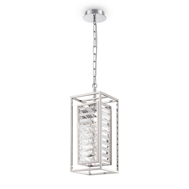 Арматура – металл, оттенки – хром, золото. Двойной геометрический плафон. Металлический каркас плафона окрашен в тон арматуре. Декор – стеклянные кри сталлы с трапециевидной огранкой. Высота подвесных моделей регулируется.