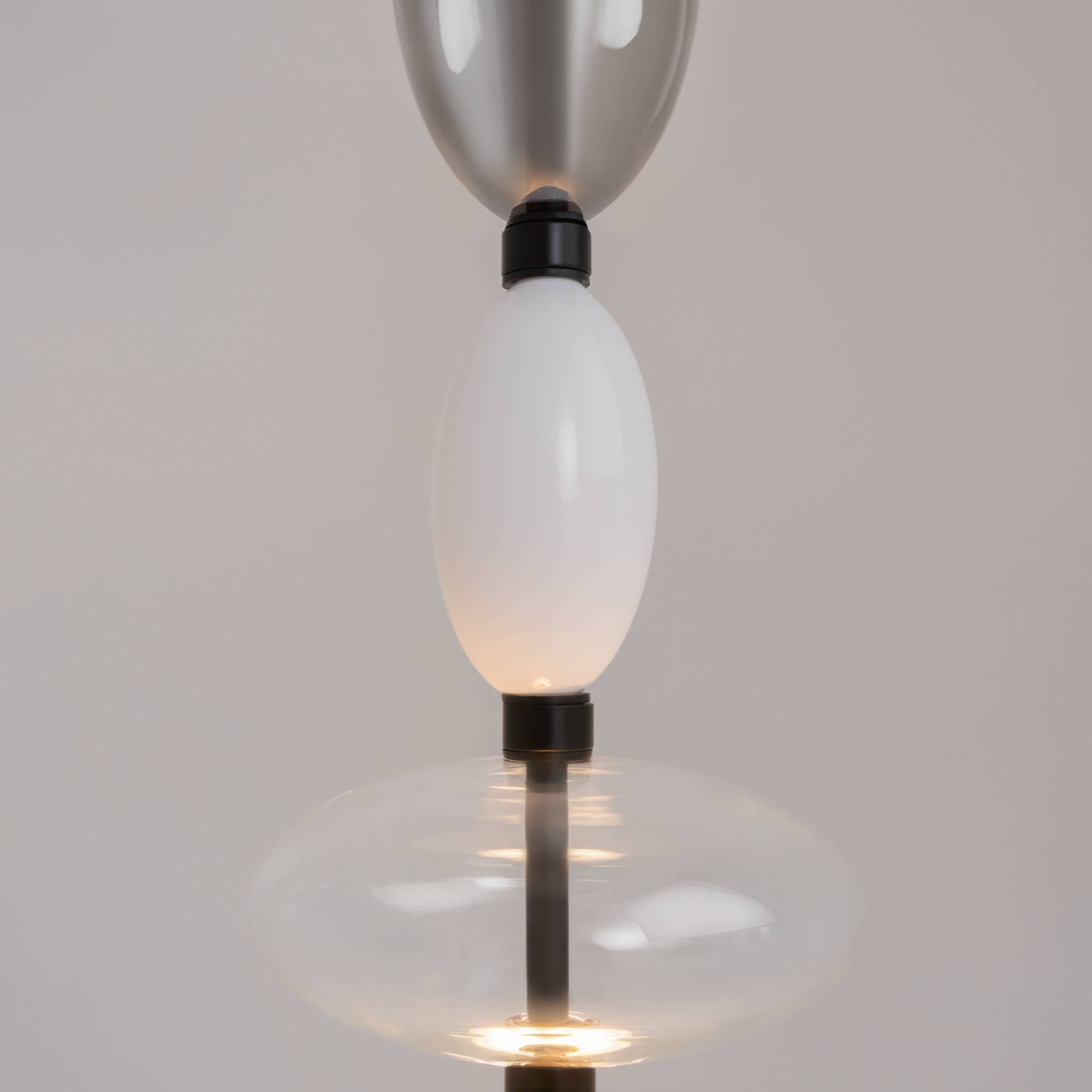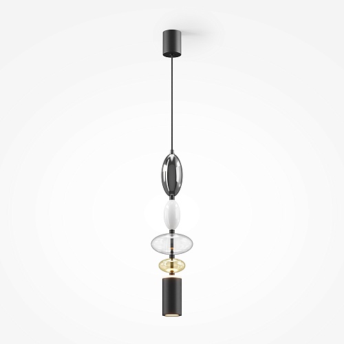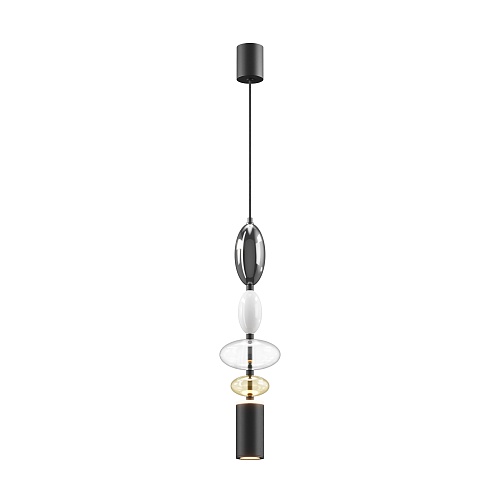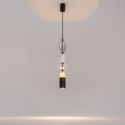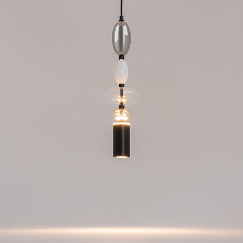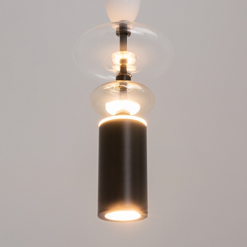 Черная металлическая арматура. Плафоны из стекла коньячного, белого, дымчатого цвета и прозрачный. Источник света комбинированный: нижний - съемная лампа с цоколем GU10, верхний - встроенный LED. Цветовая температура светильников 2700К, угол рассеивания света 120 градусов. Высота регулируется с помощью провода длиной 3 м. Монохромный дизайн, стеклянные элементы впишутся в различные стили интерьеров.