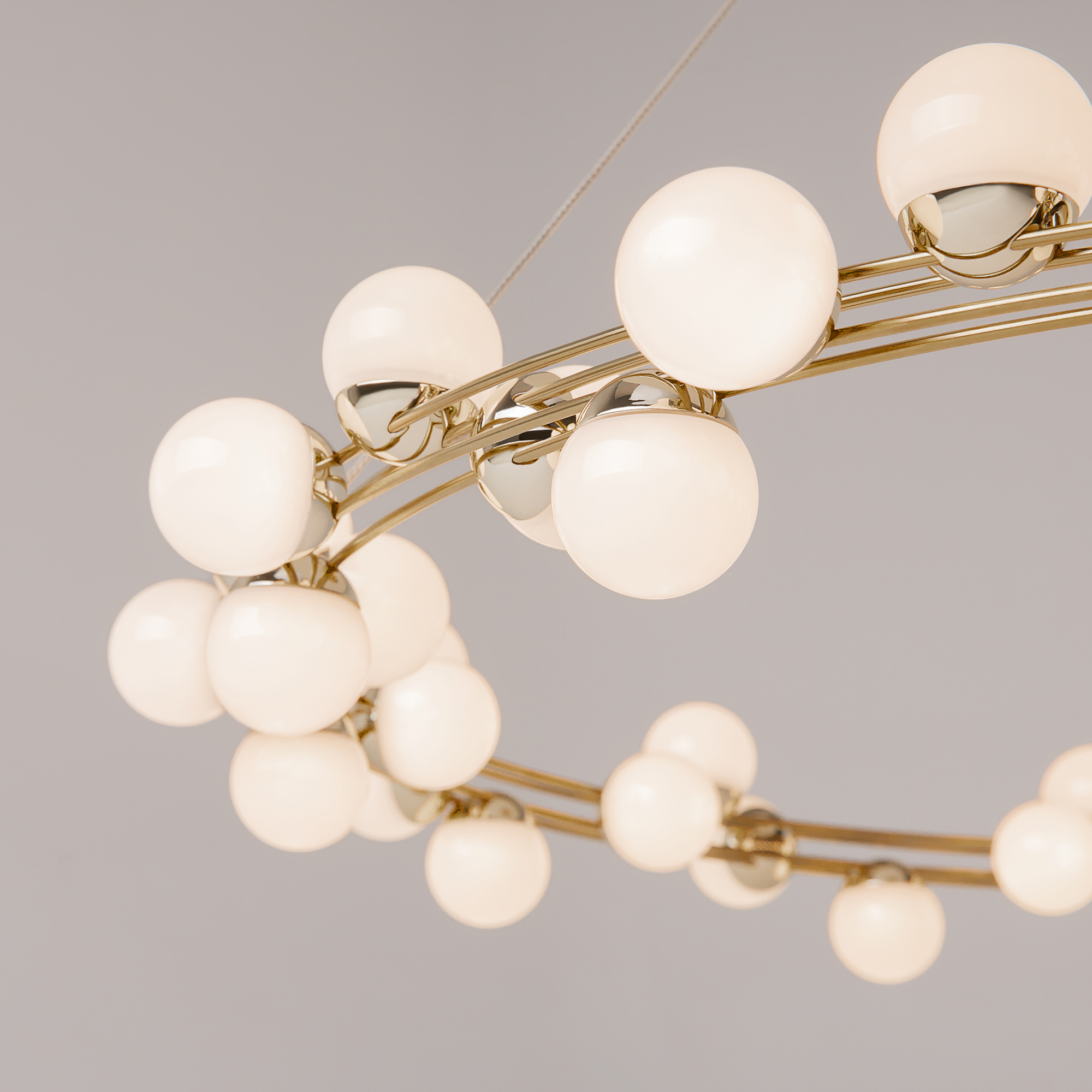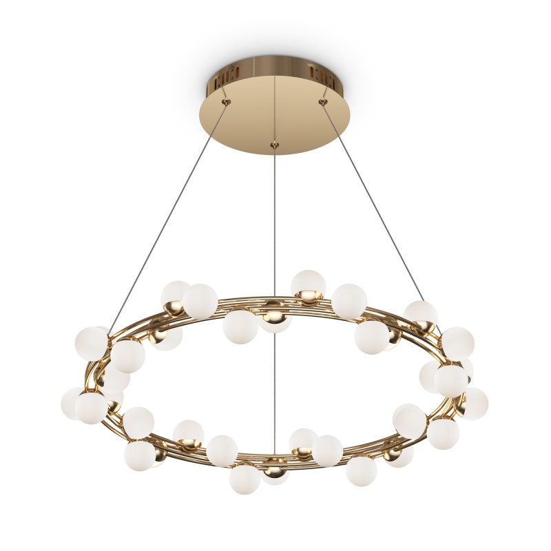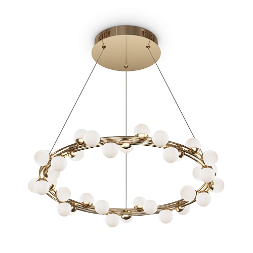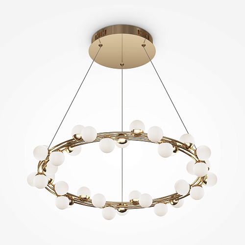 Арматура из металла в золотом цвете. Плафоны-сферы — белый пластик. Дизайн с имитацией молекулярной структуры. LED-источники света.