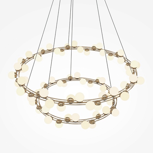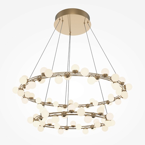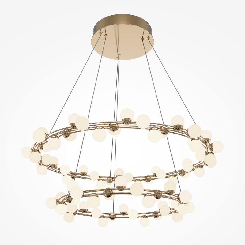 Арматура из металла в золотом цвете. Плафоны-сферы — белый пластик. Дизайн с имитацией молекулярной структуры. LED-источники света.