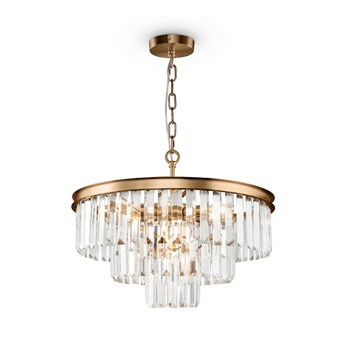 Арматура из металла в трех оттенках: латунь, хром, золото. Многоярусный декор. Подвески: прозрачное (арматура – хром, латунь) и янтарное (арматура – золото) стекло. Высота подвесных моделей регулируется.