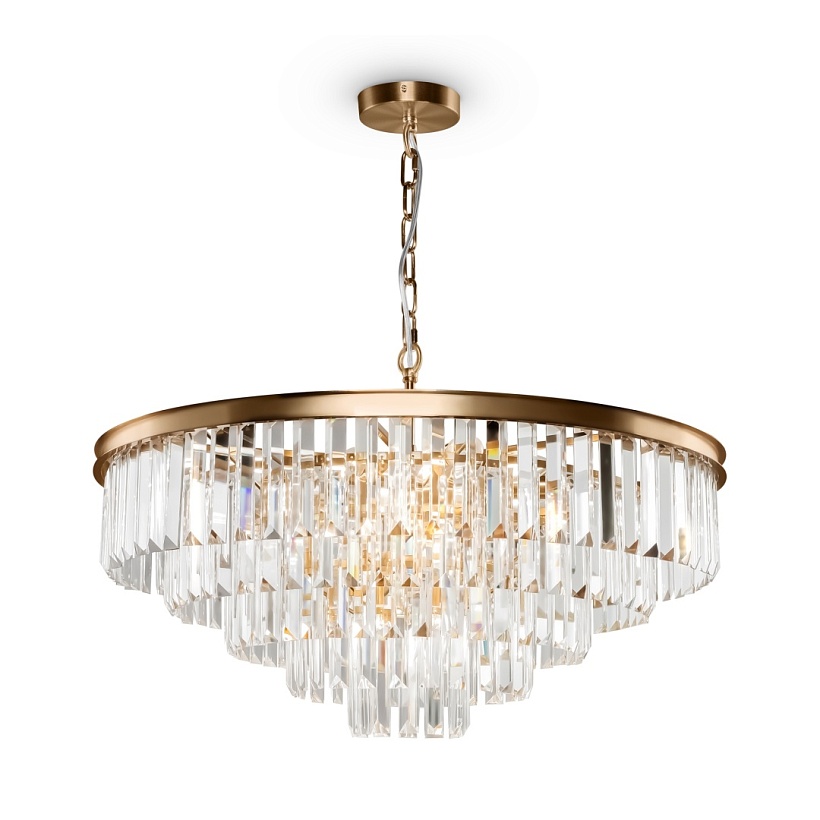 Арматура из металла в трех оттенках: латунь, хром, золото. Многоярусный декор. Подвески: прозрачное (арматура – хром, латунь) и янтарное (арматура – золото) стекло. Высота подвесных моделей регулируется.