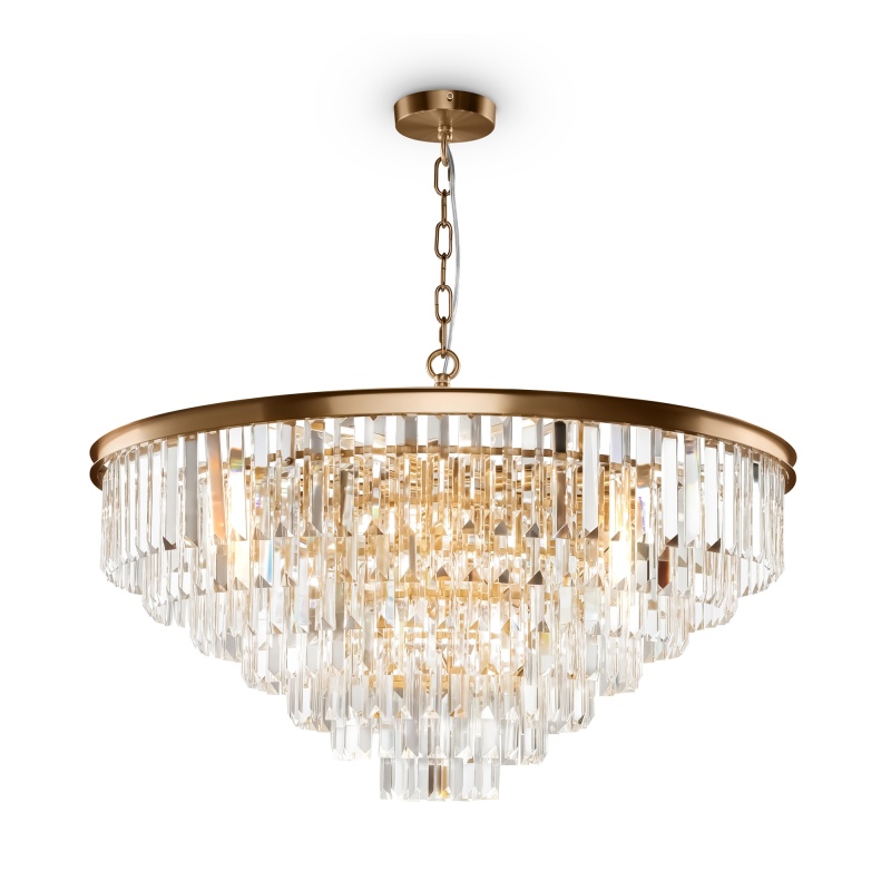 Арматура из металла в трех оттенках: латунь, хром, золото. Многоярусный декор. Подвески: прозрачное (арматура – хром, латунь) и янтарное (арматура – золото) стекло. Высота подвесных моделей регулируется.