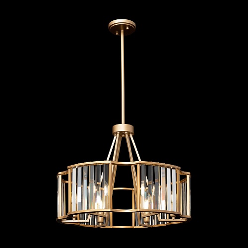 Арматура из металла в золотом цвете. Прозрачный стеклянный декор закреплен на металлическом каркасе, окрашенном в тоне арматуре. Источники света в форме свечей.