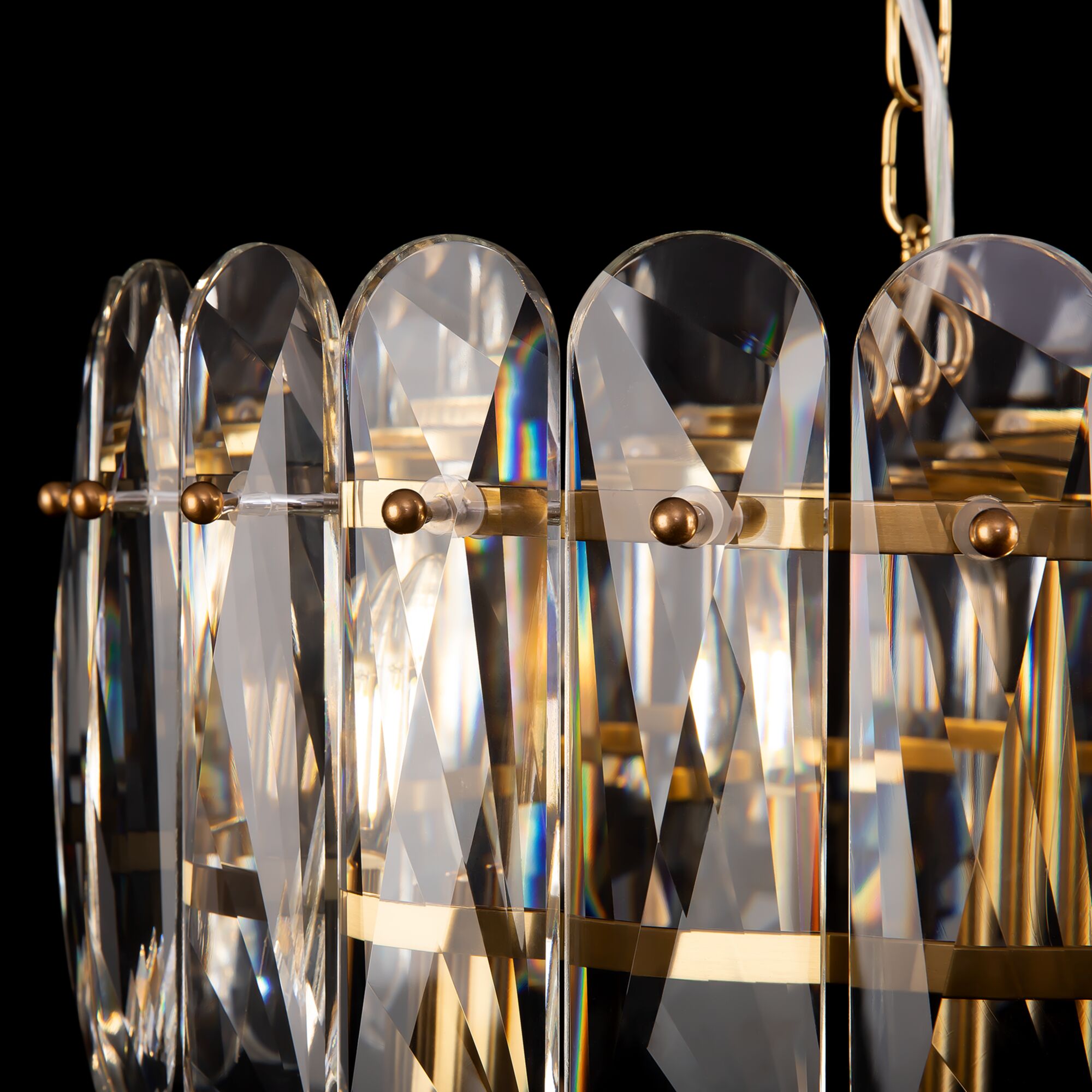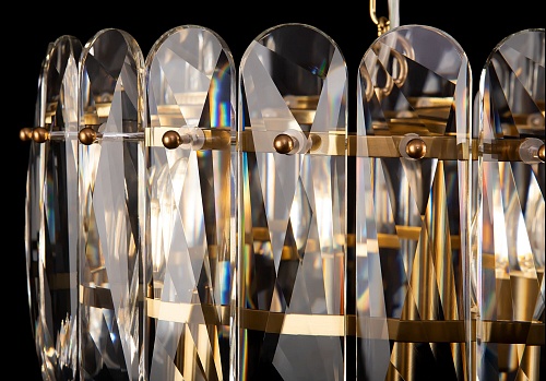 Арматура из металла, цвет – латунь. Декор – пластины из прозрачного стекла, инкрустированные в латунную основу. Источники света в форме свечей. Цоколь Е14.
