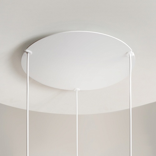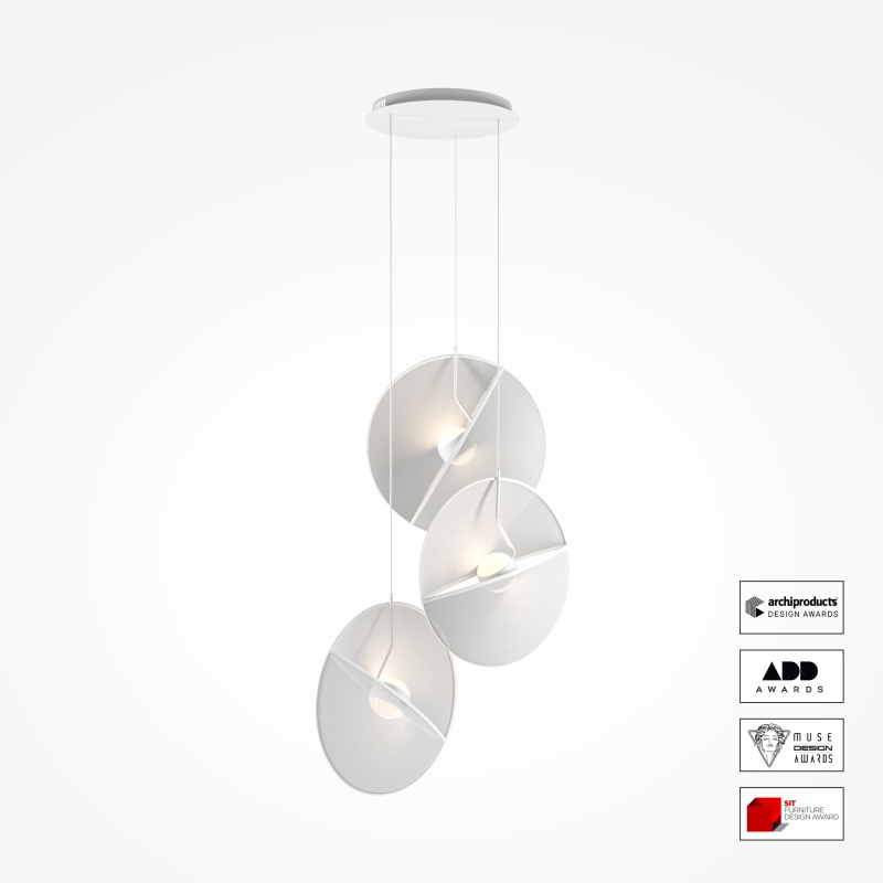 Арматура и плафон из металла и акрила. Цвет — белый. Декоративный светоотражающий элемент из полупрозрачной текстурированной ткани. Регулируемая высота. LED-источники света с цветовой температурой 3000К.