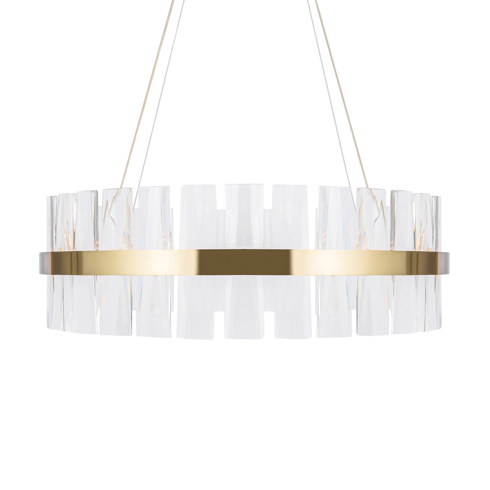 Материал арматуры - металл, цвет - латунь. Декор - объемные прозрачные хрустальные элементы с чередующимся рисунком. LED источник света, цветовая температура - 3000К. Регулируемая длина тросов.