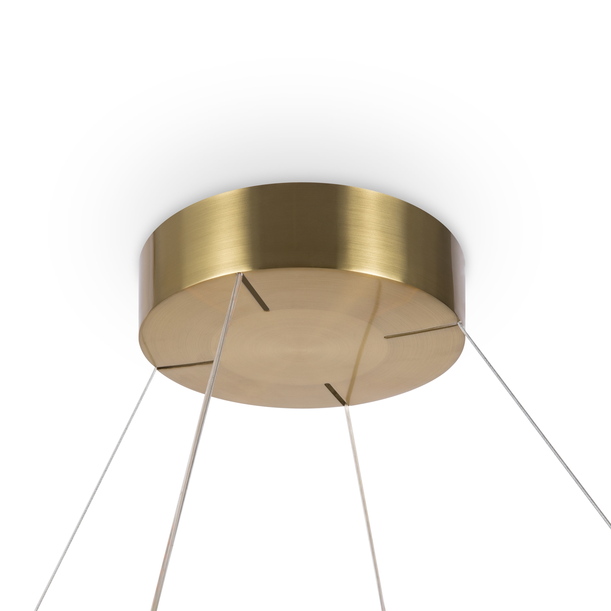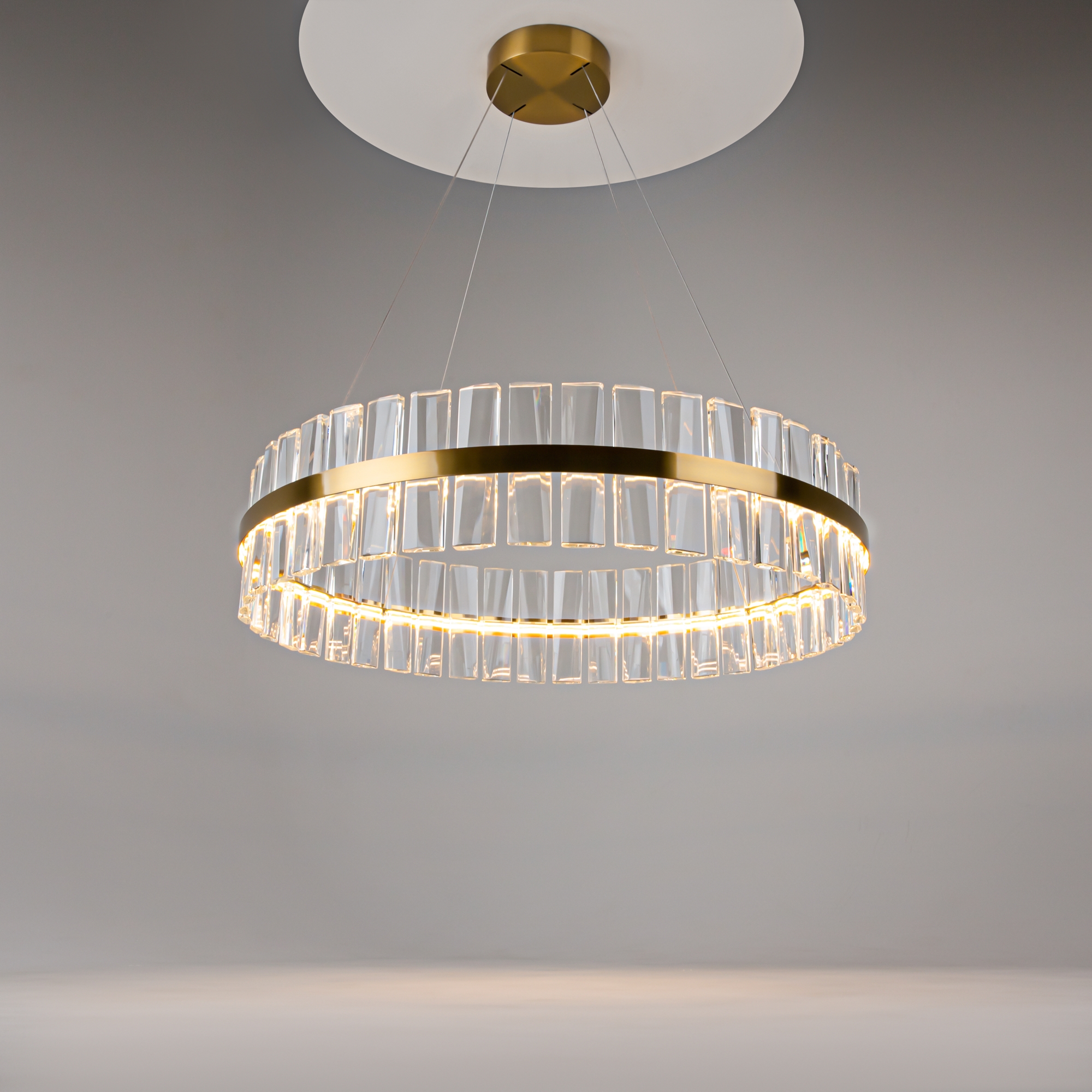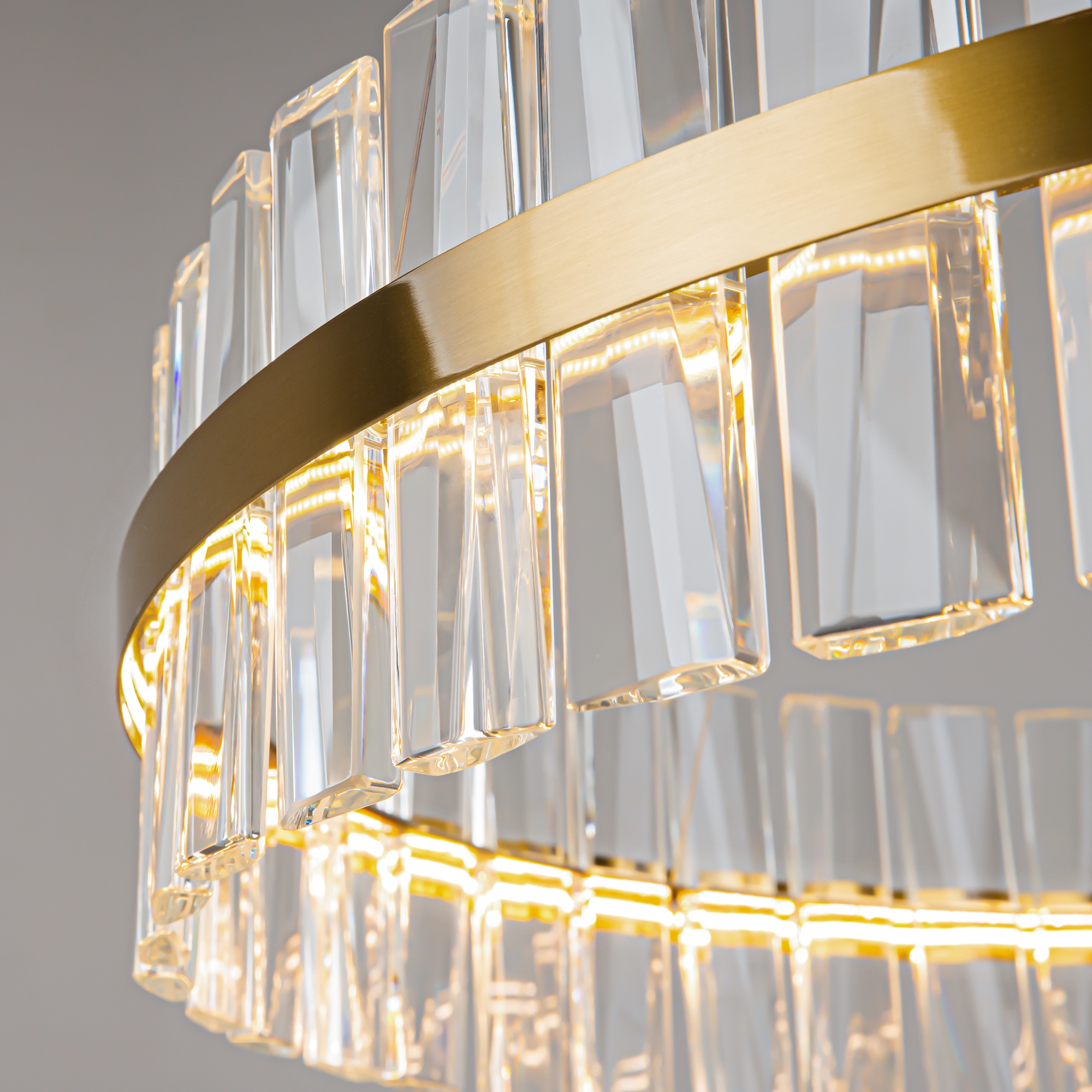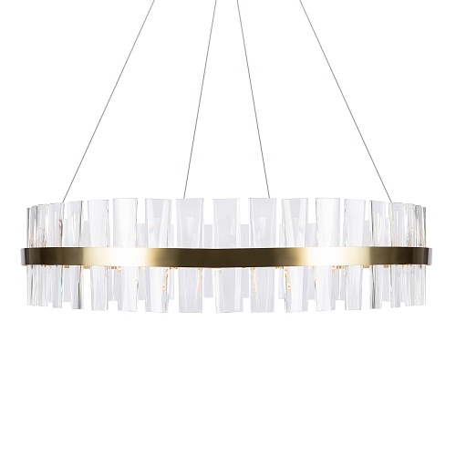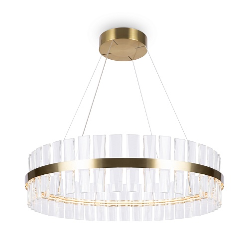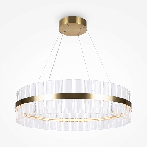 Материал арматуры - металл, цвет - латунь. Декор - объемные прозрачные хрустальные элементы с чередующимся рисунком. LED источник света, цветовая температура - 3000К. Регулируемая длина тросов.