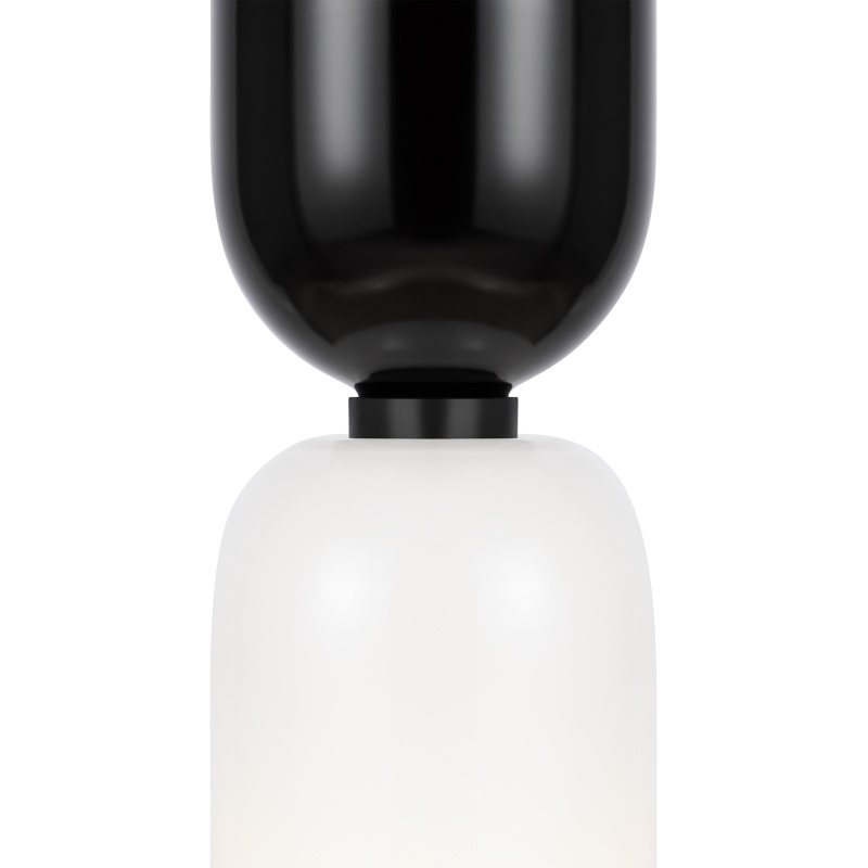 Металлическая арматура, цвет - черный. Светильники стилизованы под форму песочных часов с обтекаемой формой. Керамические элементы с глянцеовй глазурью. Подвесные светильники с плафонами из белой керамики с прозрачным, черно-белым, золото-белым и белым стеклом. Регулируемая высота подвесных светильников.
