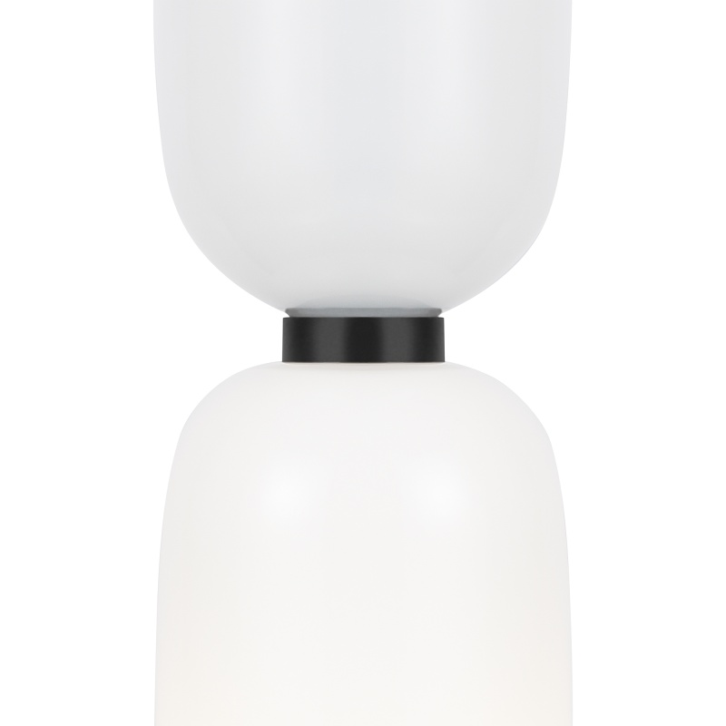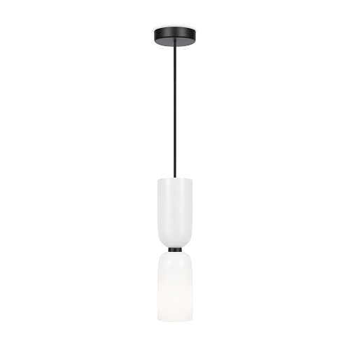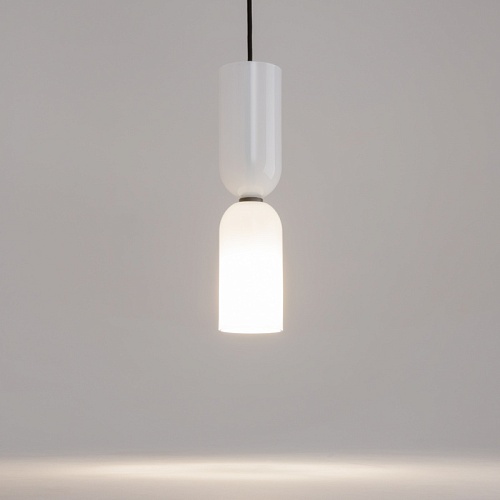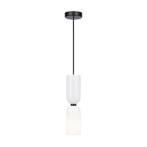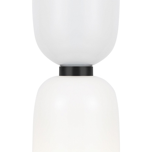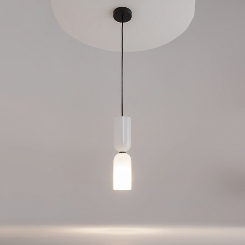 Металлическая арматура, цвет - черный. Светильники стилизованы под форму песочных часов с обтекаемой формой. Керамические элементы с глянцеовй глазурью. Подвесные светильники с плафонами из белой керамики с прозрачным, черно-белым, золото-белым и белым стеклом. Регулируемая высота подвесных светильников.