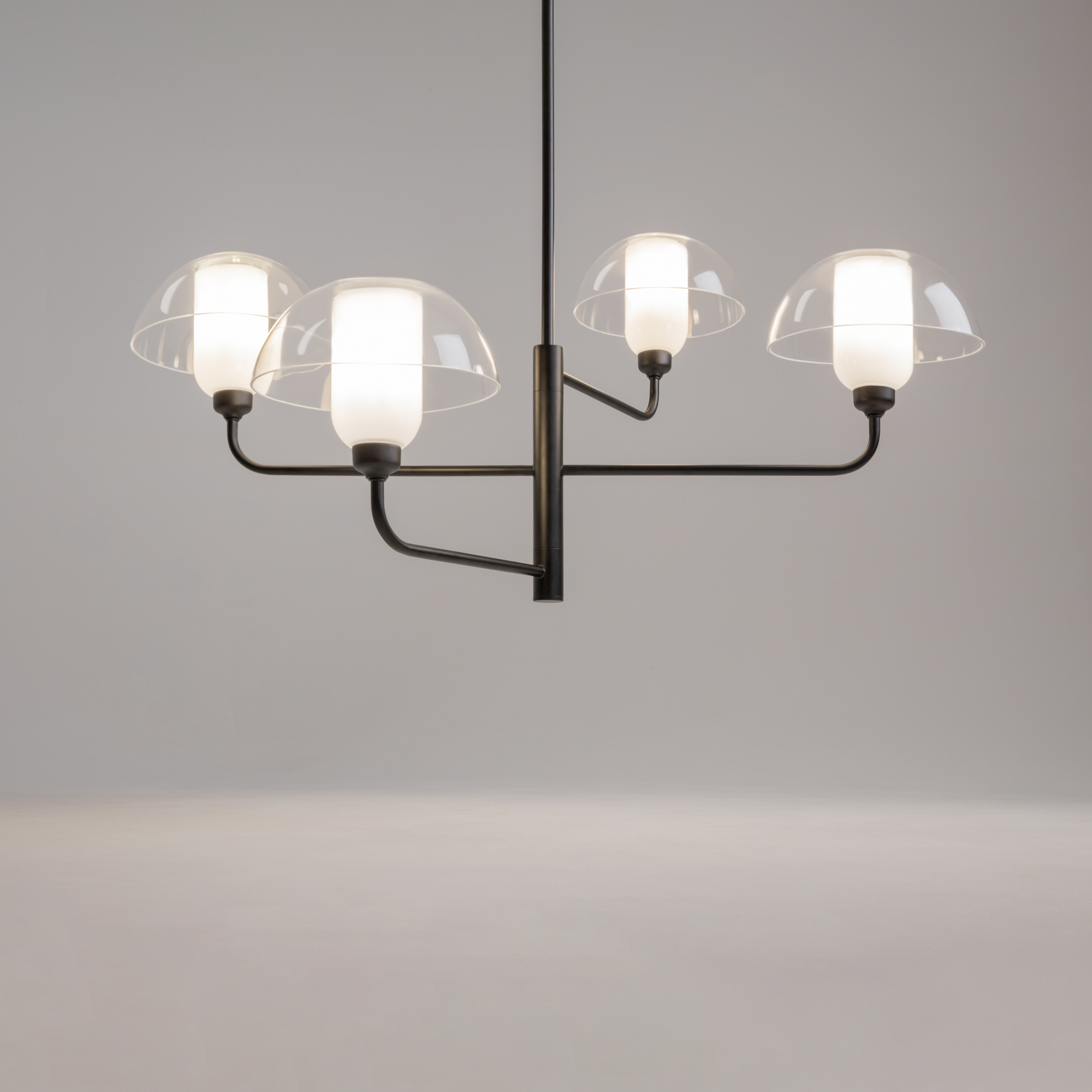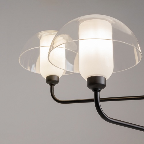 Металлическая арматура, цвет - черный. Светильники стилизованы под форму песочных часов с обтекаемой формой. Керамические элементы с глянцеовй глазурью. Подвесные светильники с плафонами из белой керамики с прозрачным, черно-белым, золото-белым и белым стеклом. Регулируемая высота подвесных светильников.