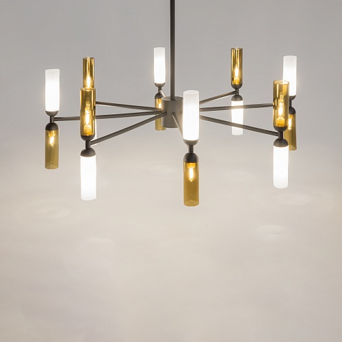 Металлическая арматура, цвет - черный. Светильники стилизованы под форму песочных часов с обтекаемой формой. Керамические элементы с глянцеовй глазурью. Подвесные светильники с плафонами из белой керамики с прозрачным, черно-белым, золото-белым и белым стеклом. Регулируемая высота подвесных светильников.