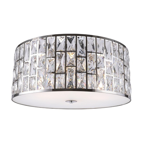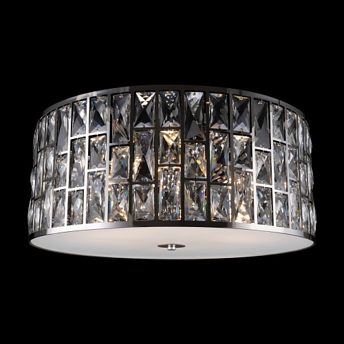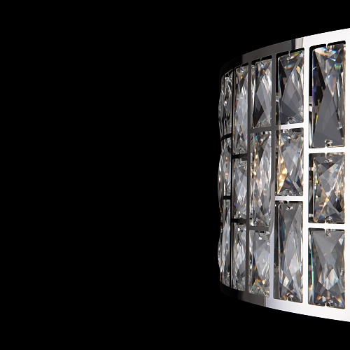 Металлическая арматура, цвет – хром. Каркас абажура – металл, декор – прозрач ный хрусталь. Потолочные модели с рассеивателем из матового стекла. Высота подвесных светильников регулируется.