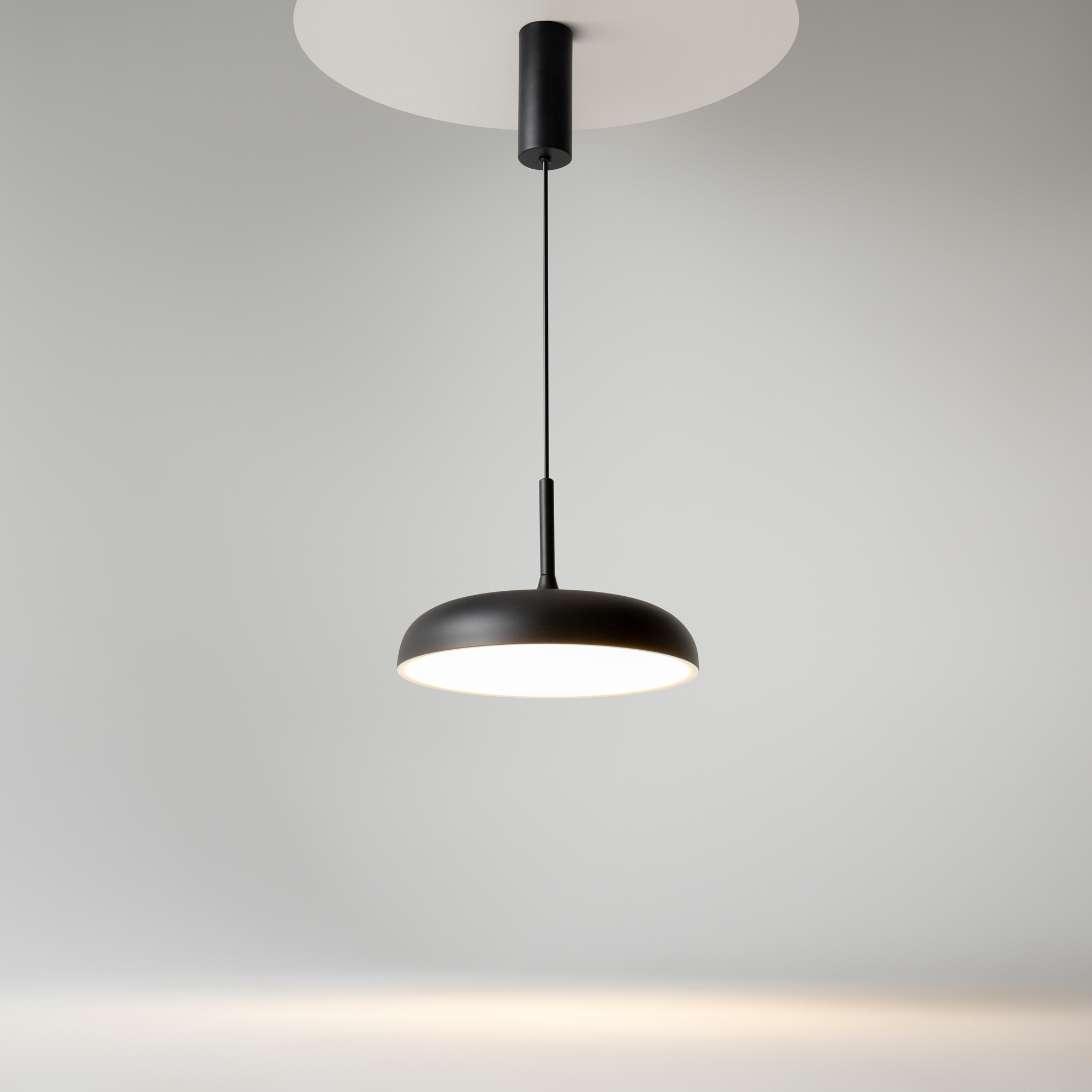 Арматура и плафон из металла,цвета - черный, белый, серый. Шагреневая поверхность - предотвращает следы от рук и пыли. Белый матовый рассеиватель из акрила хорошо пропускает свет, предотвращает слепящий эффект. Регулируемая длина провода - до 3 метров. LED-источник света. Цветовая температура 3000К.