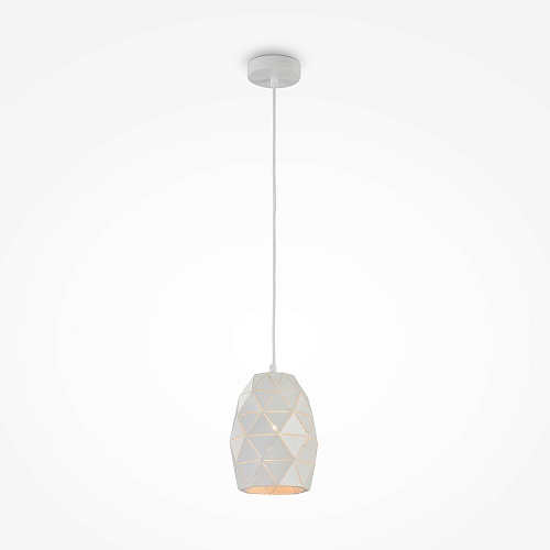 Металлическая арматура в двух оттенках: латунь, белый. Материал плафона – металл, оттенки – золото, белый. Сложная архитектурная форма плафона с прорезями. Регулируемая высота.