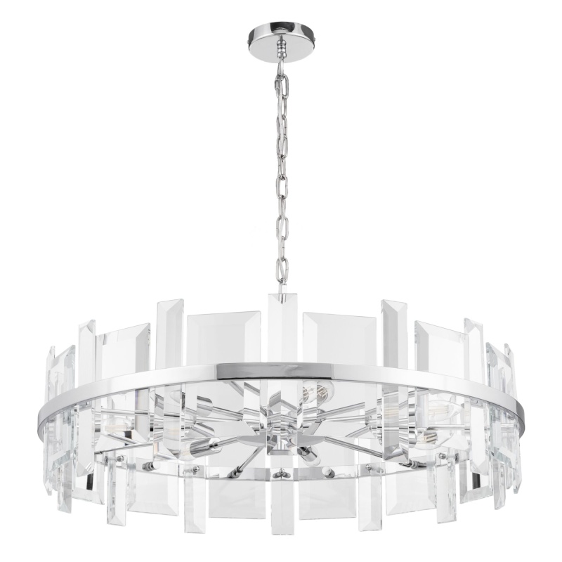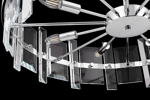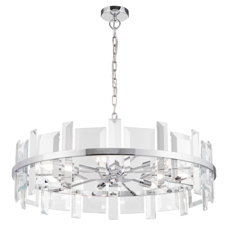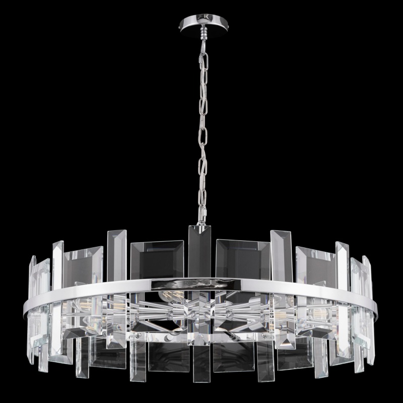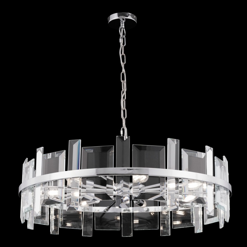 Арматура из металла, цвет – хром. Плафон составляют пластины из прозрачного оптического стекла. Металлический каркас плафона окрашен в тон арматуре. Высота подвесных моделелей регулируется.