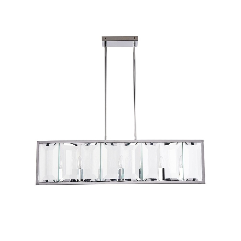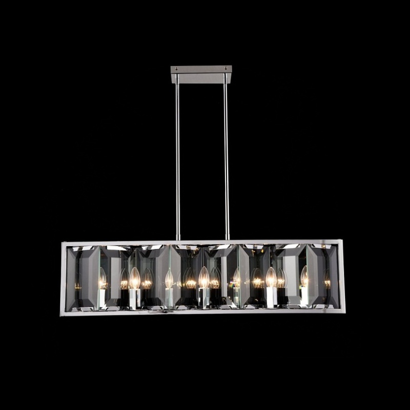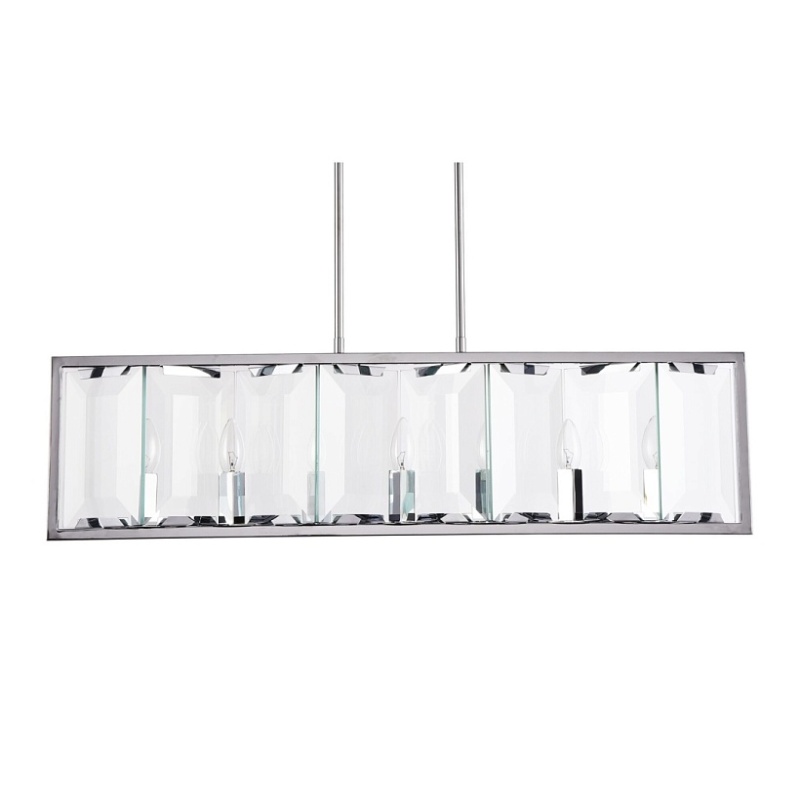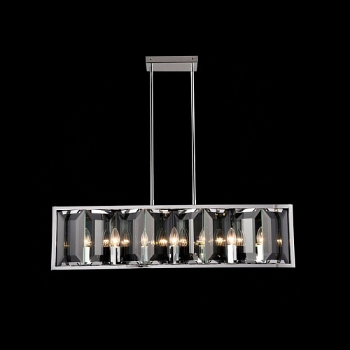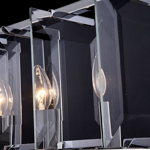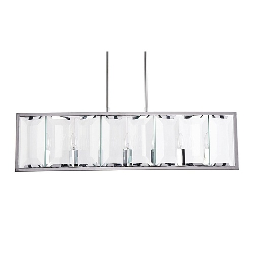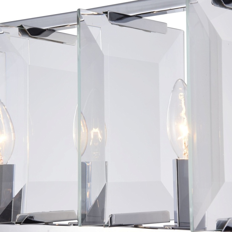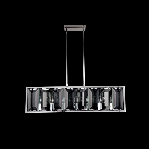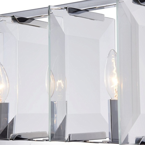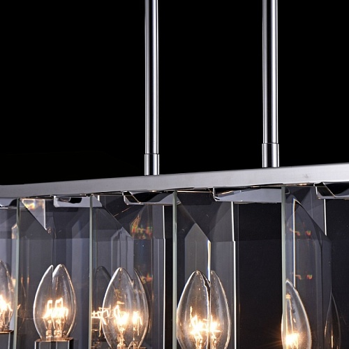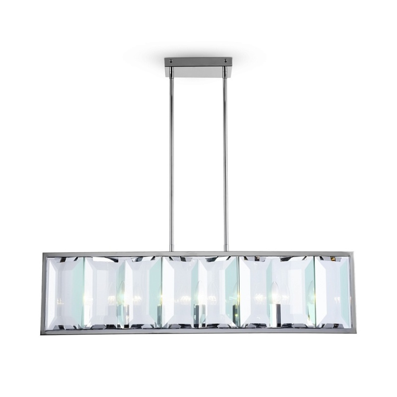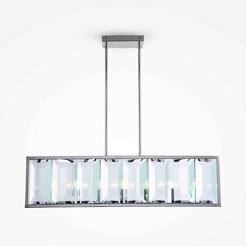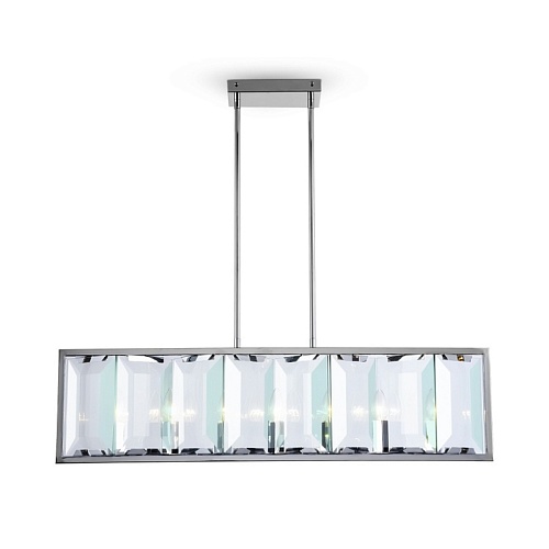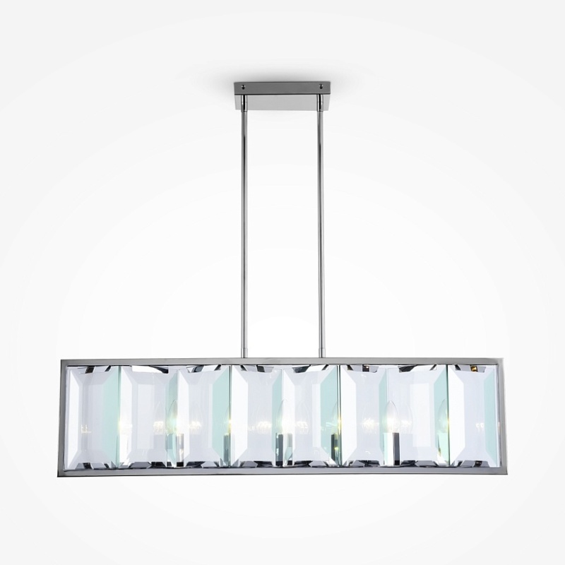 Арматура из металла, цвет – хром. Плафон составляют пластины из прозрачного оптического стекла. Металлический каркас плафона окрашен в тон арматуре. Высота подвесных моделелей регулируется.