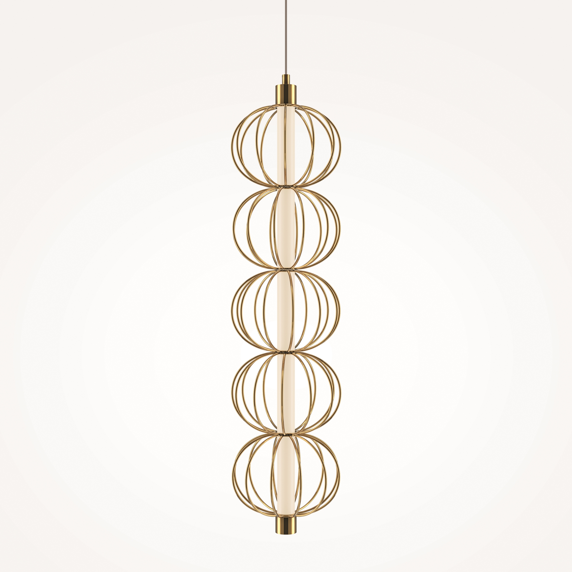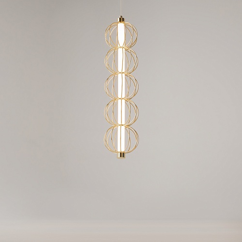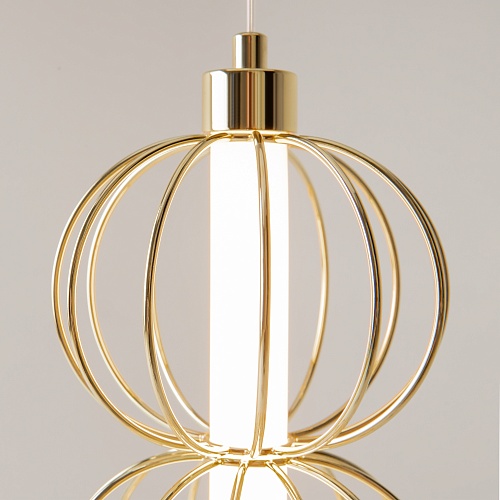 Арматура - металл, цвет - золото. Декоративные проволочные плафоны-сферы - ручная работа. Горизонтальные подвесы в двух вариатах монтажа - накладном и скрытом. Све товой элемент - силиконоваая трубка с LED-источником. Цветовая температура 3000К.