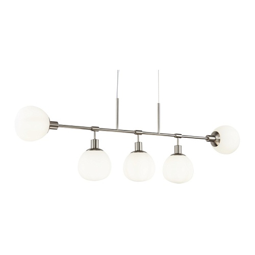 Металлическая арматура, цвет – никель, латунь. Плафоны – выдувное стекло белого цвета. Широкая семья. У торшера и настольной лампы можно изменять положение плафона. Регулируемая высота.