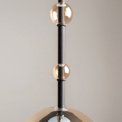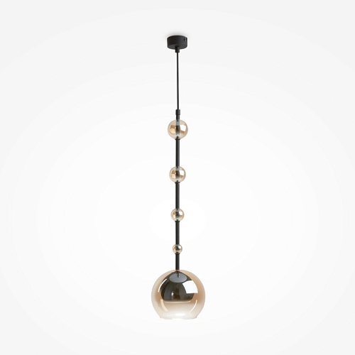 Арматура - металл, плафоны - стекло. Цветовый комбинации арматуры и плафона: черный + прозрачный, черный + янтарный, латунь + прозрачный. Элементы декора - выдувные "бусины" из стекла. Высота проводов регулируется. Источник света - лампа с цоколем GU10.