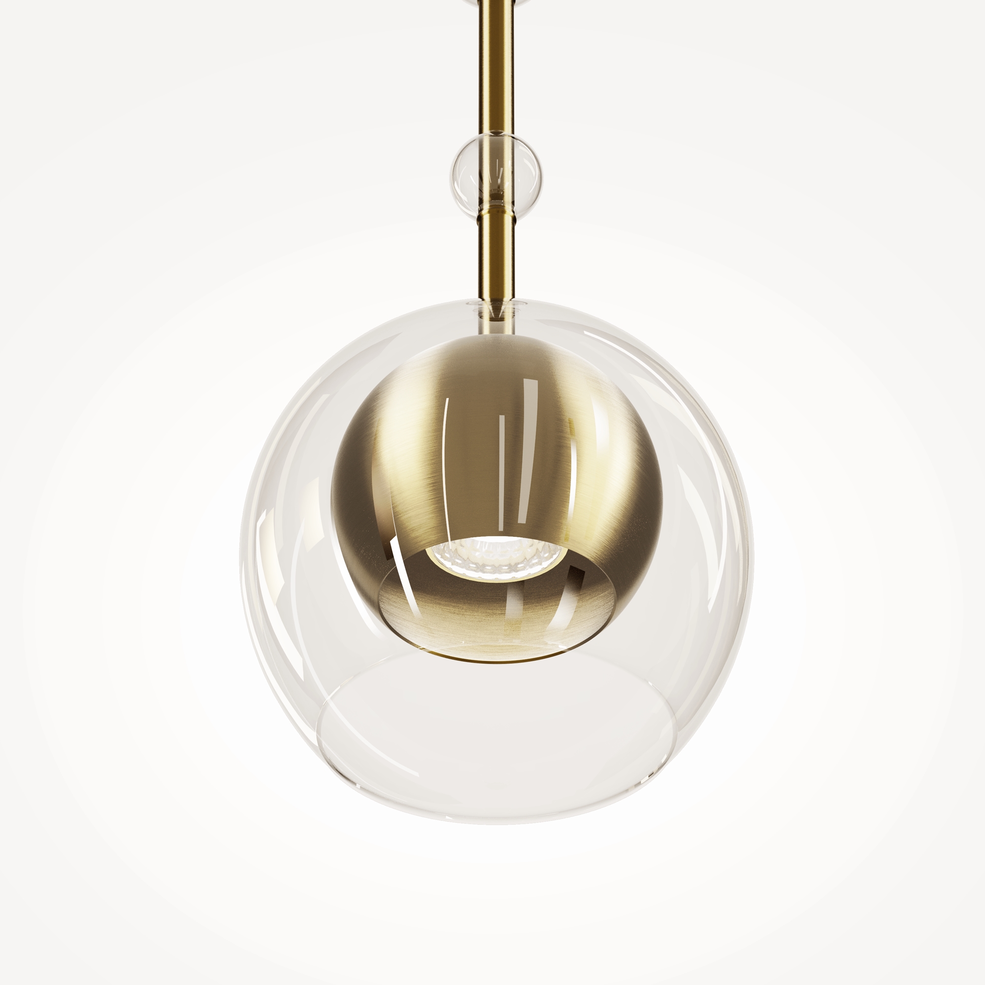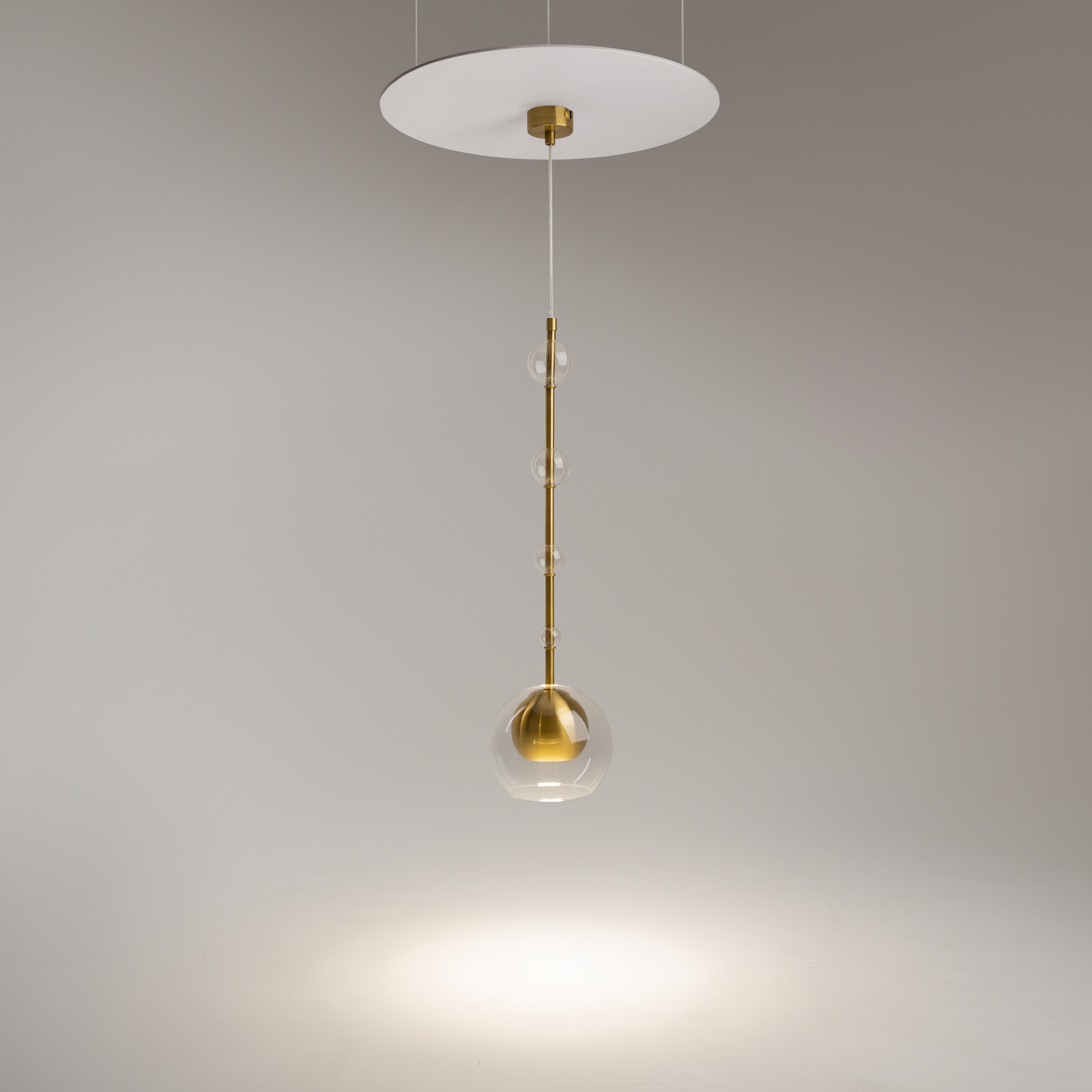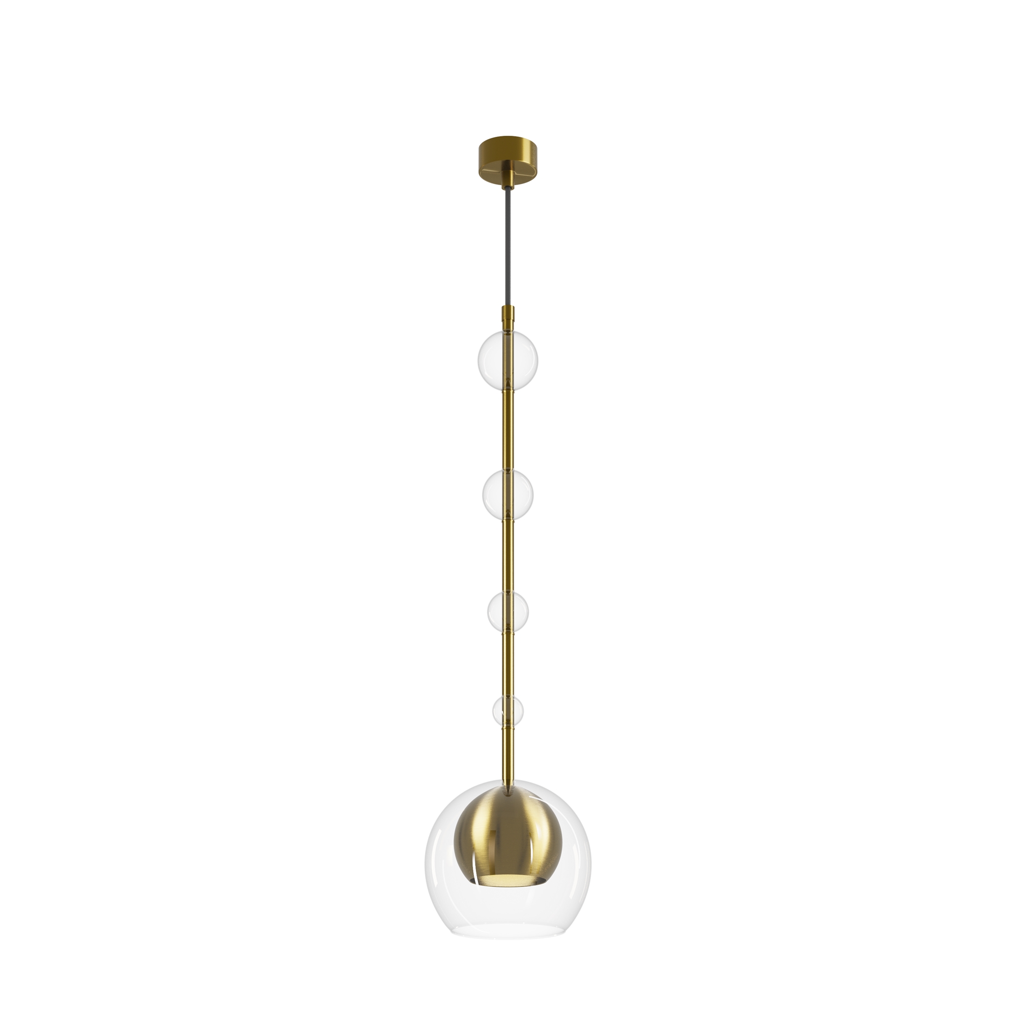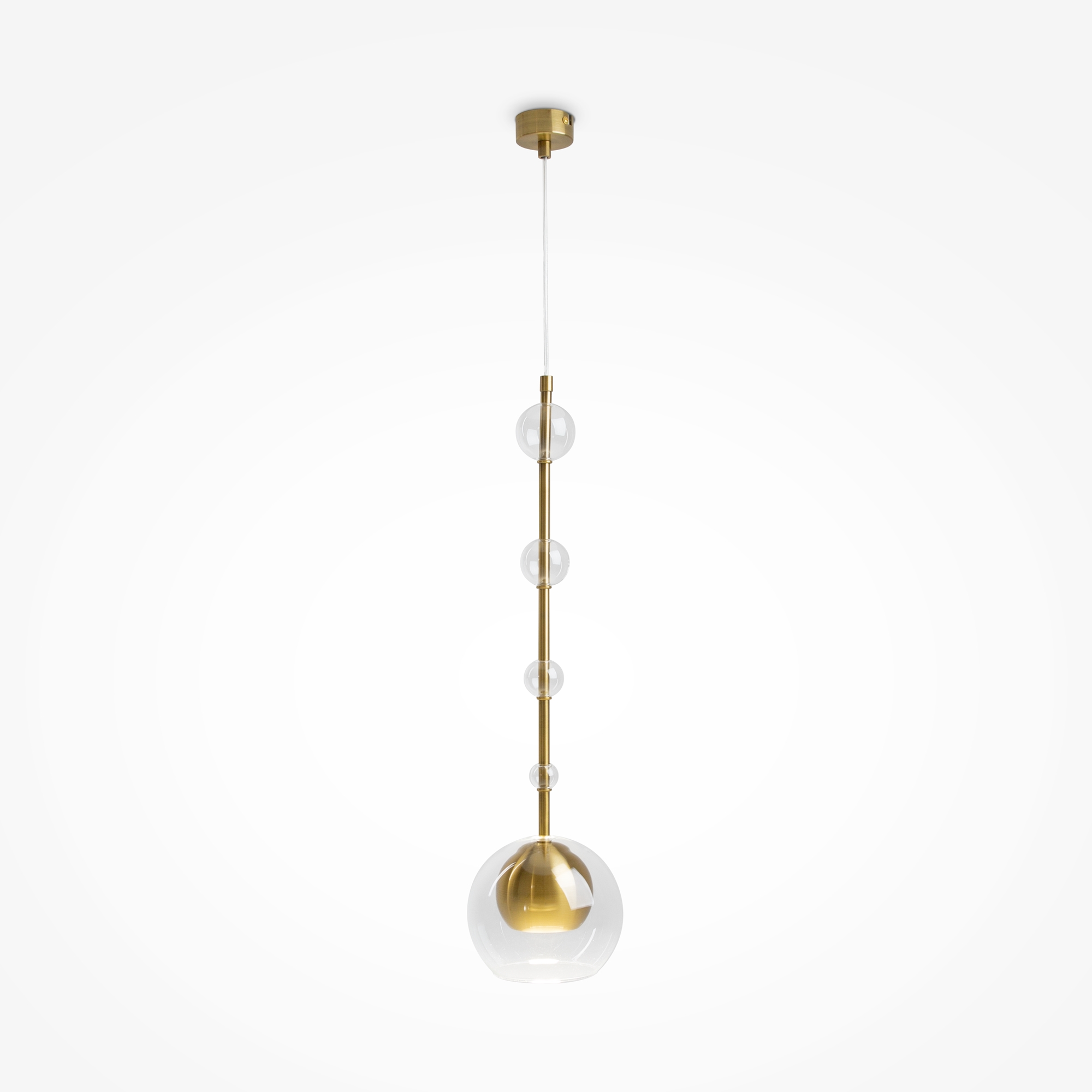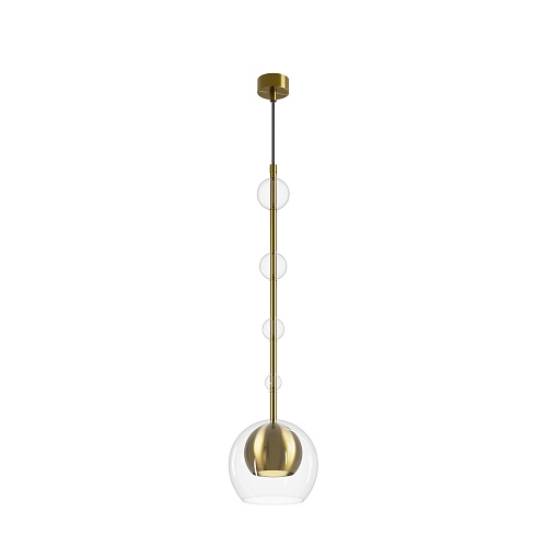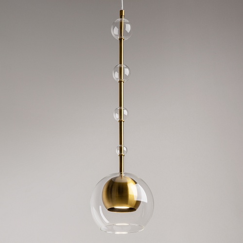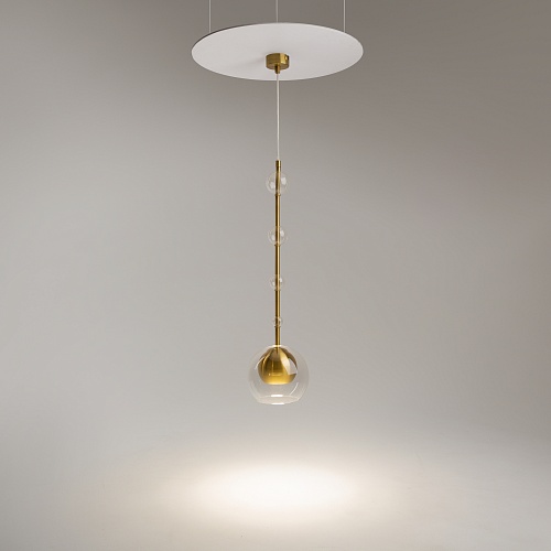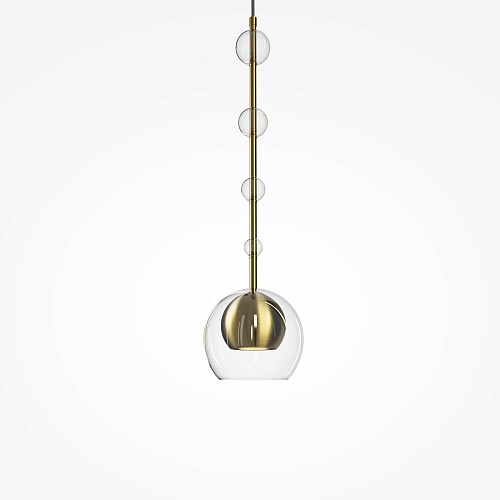 Арматура - металл, плафоны - стекло. Цветовый комбинации арматуры и плафона: черный + прозрачный, черный + янтарный, латунь + прозрачный. Элементы декора - выдувные "бусины" из стекла. Высота проводов регулируется. Источник света - лампа с цоколем GU10.