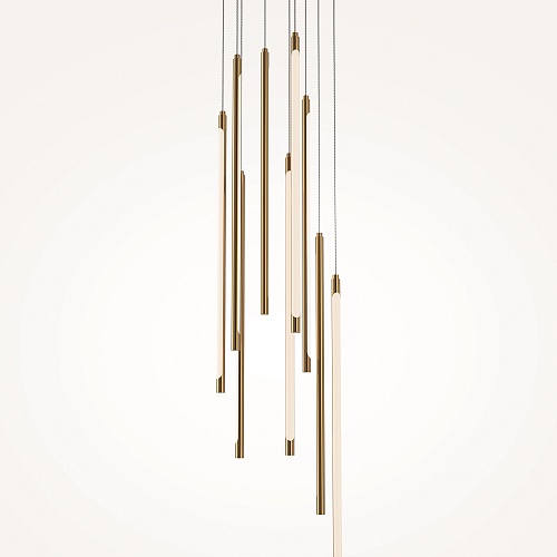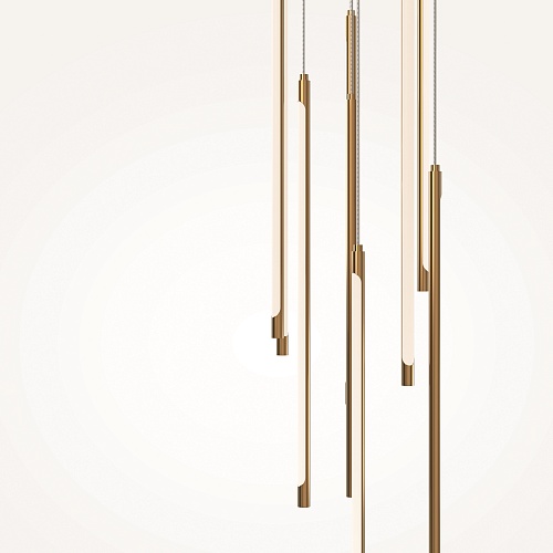 Материал арматуры - алюминий, цвет - черный, латунь. Изящные металлические «струны» в цвет арматуры со встроенным световым модулем прикрыты белым акриловым рассеивателем. Серия для акцентного и дополнительного освещения. Длина подвесных моделей регулируется. LED-источник света. У подвесных светильников есть функция диммирования. Цветовая температура 3000К.