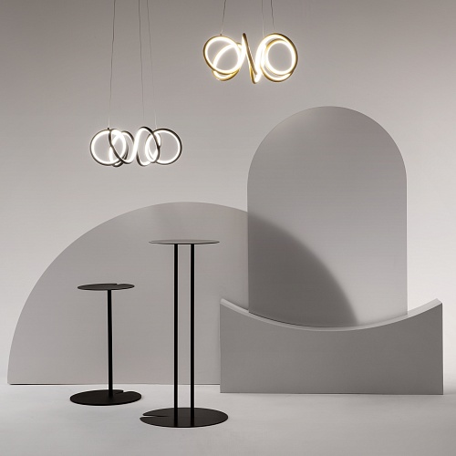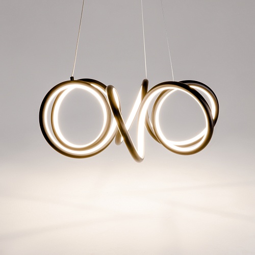 Металлическая арматура, цвета - черный, латунь. Закругленные световые элементыиз силикона со встроенным LED-источником света по всему периметру. Регулируемый диапазон цветовой тмепературы 2600К-3500К для светильников в латуни и 3000К-4000К для черных. Регулируема длина тросов. Фантазийный образ хаотичных фрагментов свободно парящих в пространстве.