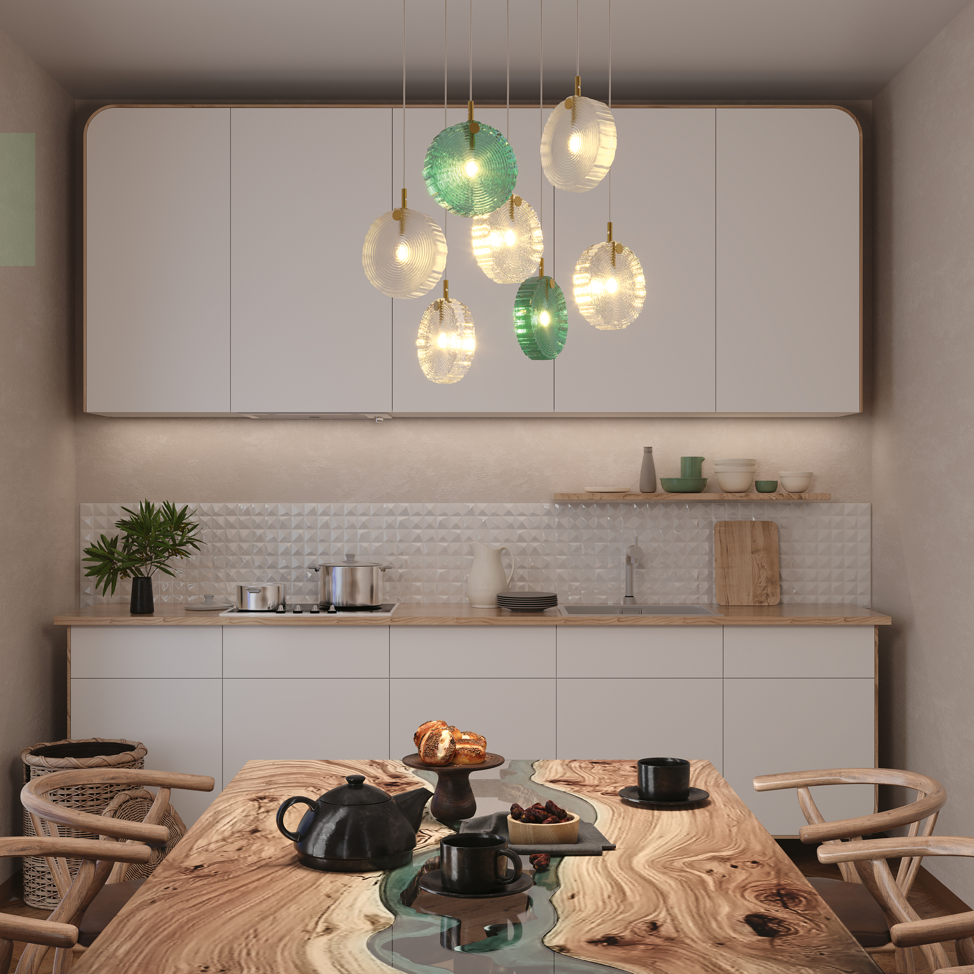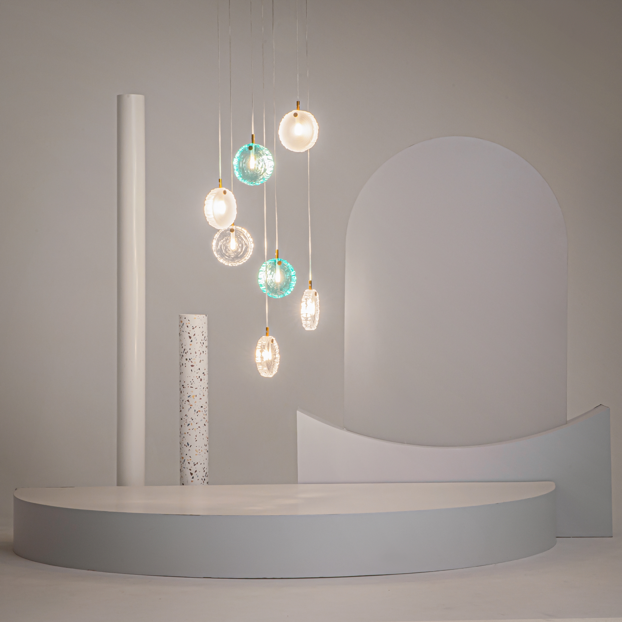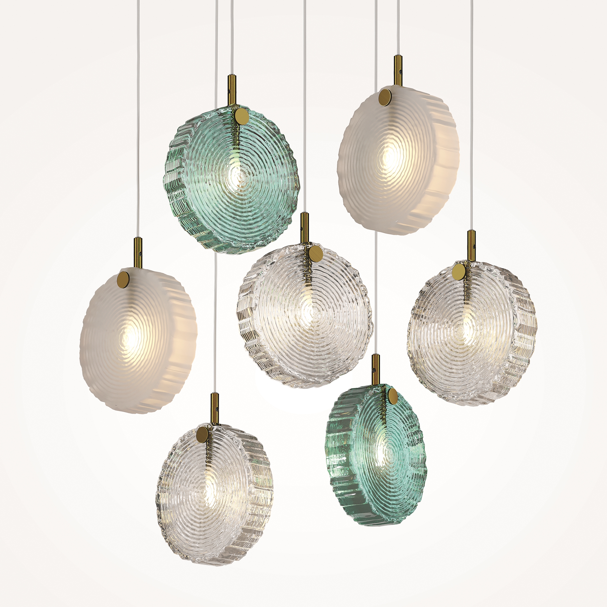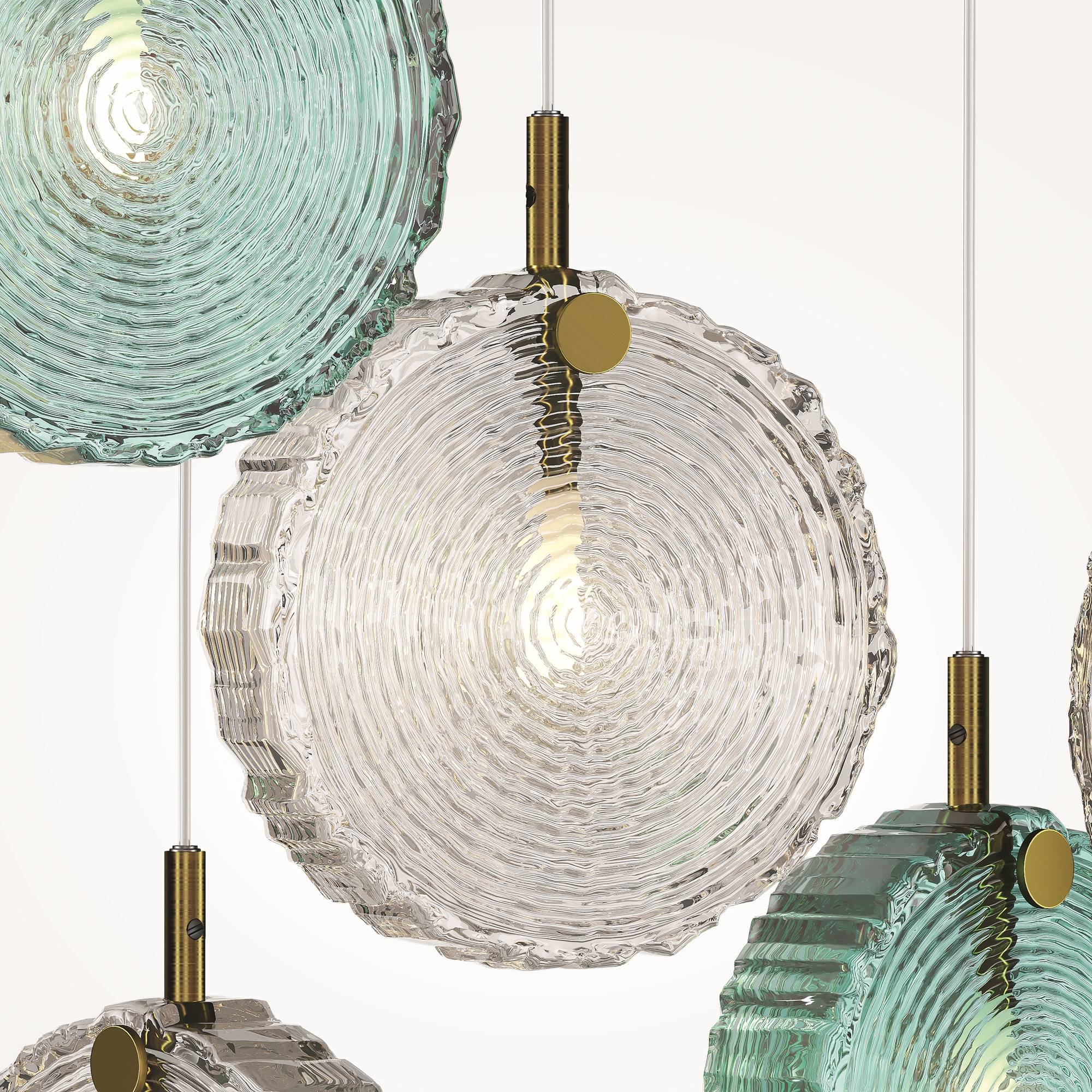 Материал арматуры - металл, цвет - латунь. Серия вдохновлена эстетикой северных лесов. Плафоны - литое цельное стекло в форме и фактуре среза дерева. Три варианта цвета плафонов: прозрачный; прозрачный + матовый; прозрачный + матовый + изумрудный. Эстетичные крепления и магнитная потолочная чаша без видимых болтов. Готовые композиции из 1, 5, 7 и 12 плафонов. Источник света - лампа с цоколем G4.