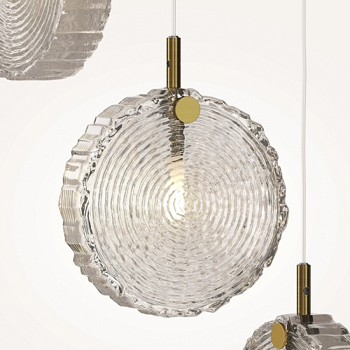 Материал арматуры - металл, цвет - латунь. Серия вдохновлена эстетикой северных лесов. Плафоны - литое цельное стекло в форме и фактуре среза дерева. Три варианта цвета плафонов: прозрачный; прозрачный + матовый; прозрачный + матовый + изумрудный. Эстетичные крепления и магнитная потолочная чаша без видимых болтов. Готовые композиции из 1, 5, 7 и 12 плафонов. Источник света - лампа с цоколем G4.