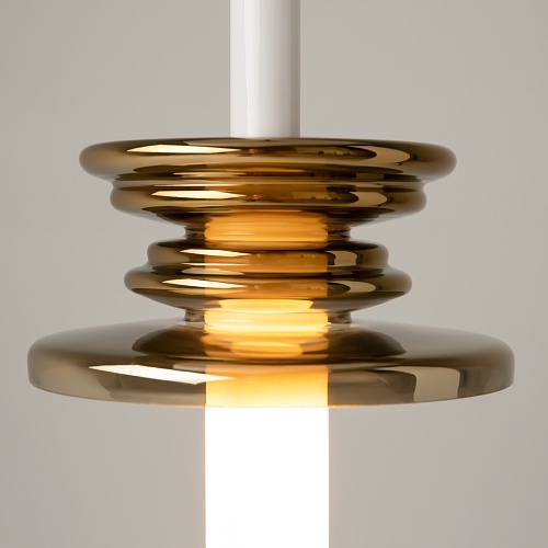 Уникальная многослойная конструкция в образе звуковой волны. Магнитная потололчная чаша из металла без видимых креплений. Плафон-трубка из белого полупрозрачного стекла. Декоративный волнообразный «звуковой» элемент из литого стекла в центре плафона. Цвета - синий, черный, золото, серый. Источник света - лампа с цоколем G9.